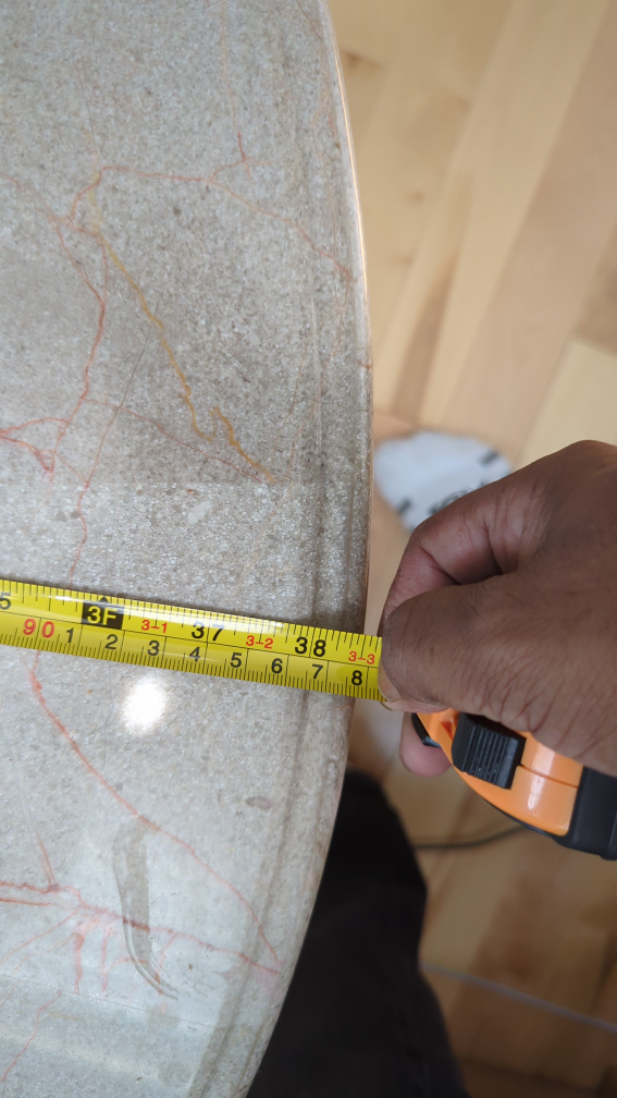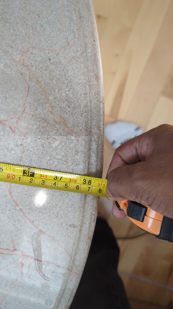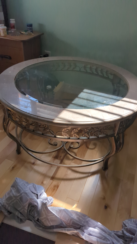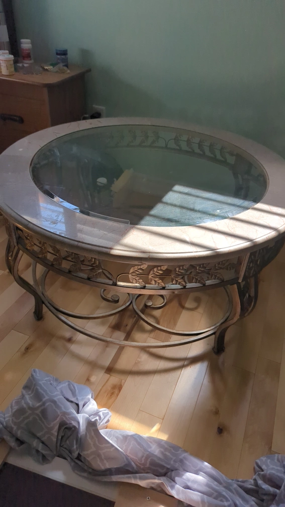 Selling a round coffee table with a marble and glass top. It's in good condition and measures approximately 38 inches in diameter. The base has a decorative metal design.π±
