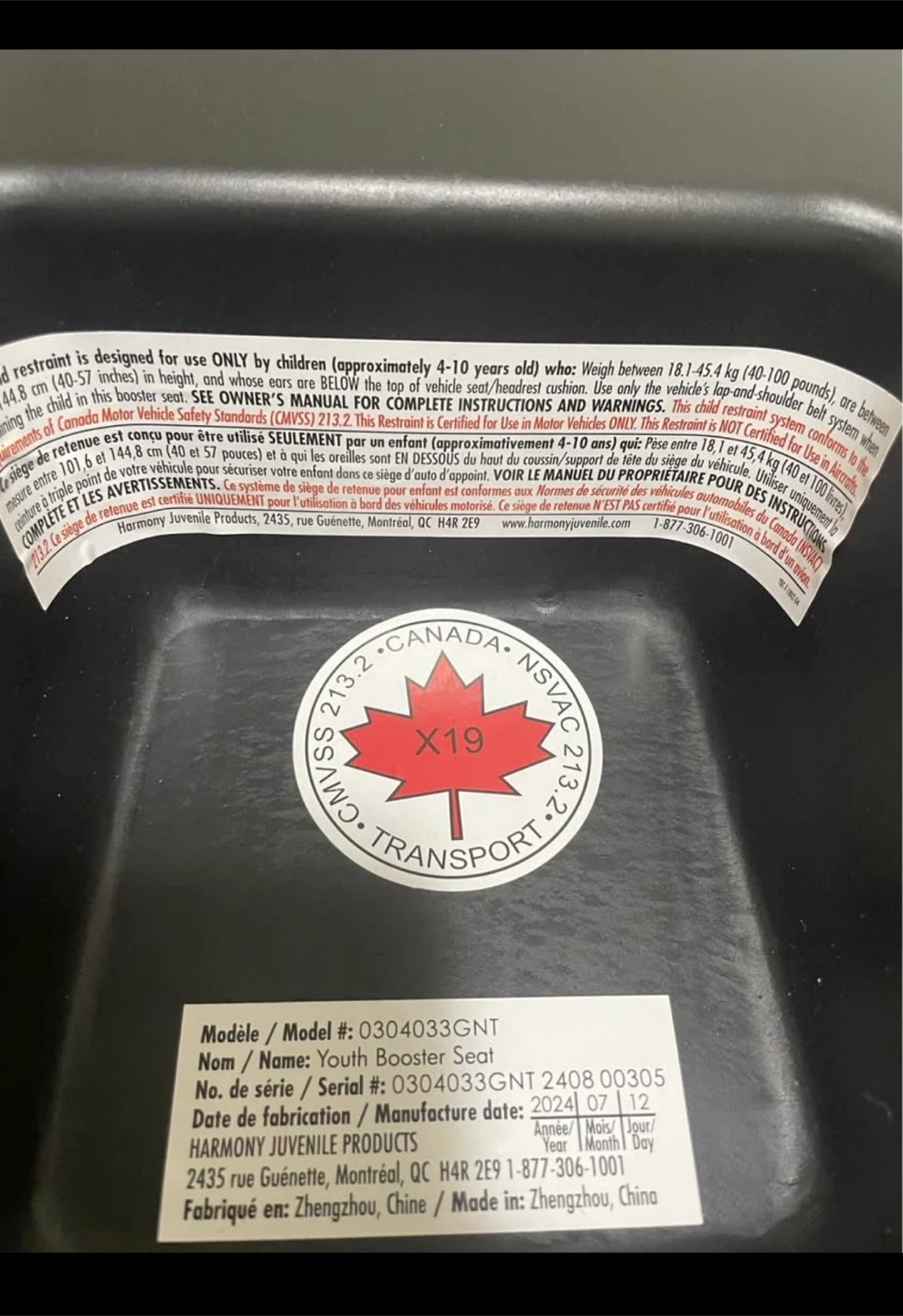 It's designed for kids weighing between 40-100 lbs and 40-57 inches tall. The manufacturing date is 2024 July 12.