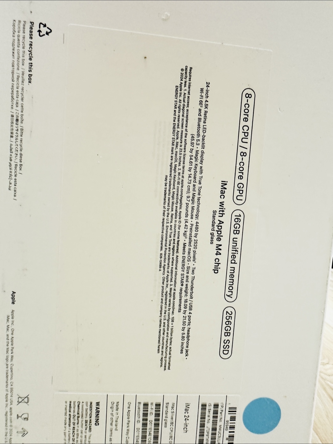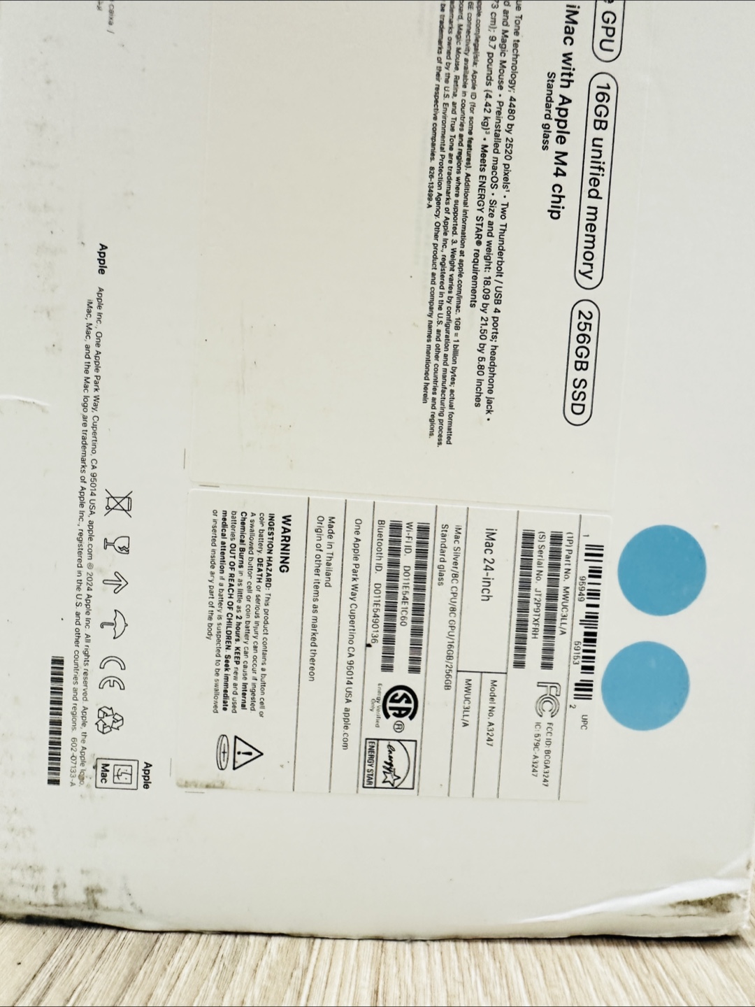 Free! Box Only. Selling a brand new Apple iMac 24-inch with the M4 chip and 256GB SSD! It comes with 16GB unified memory and an 8-core CPU / 8-core GPU. The iMac has a standard glass display and includes Thunderbolt / USB 4 ports, and a headphone jack. It also has Wi-Fi 6E and Bluetooth 5.3. The box is included!