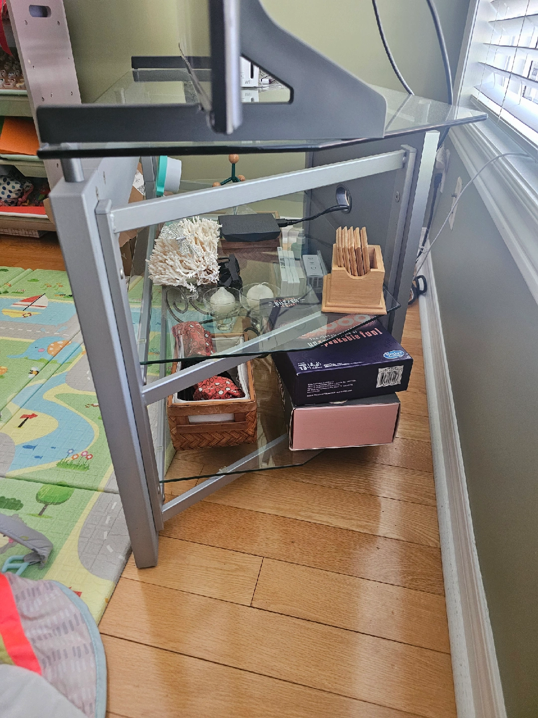 Selling a glass TV stand. It has a silver frame and two glass shelves, perfect for storing your media devices and accessories. It's in great condition and ready for a new home! 75" TV sitting on it currently