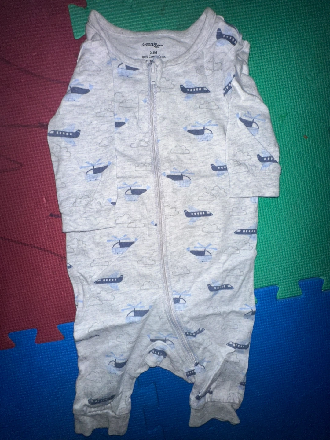 Selling a bundle of baby clothes, perfect for a little one aged 0-3 months. There's a mix of onesies, pants, and a cute zip-up sleeper. All in good condition and ready for a new home!