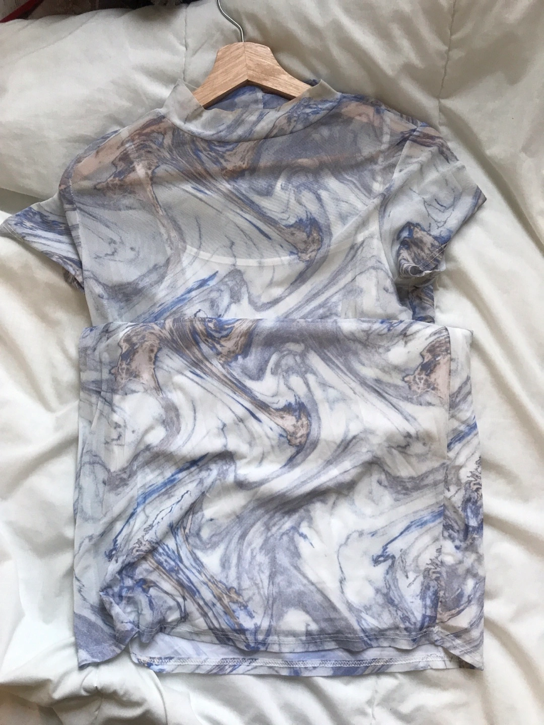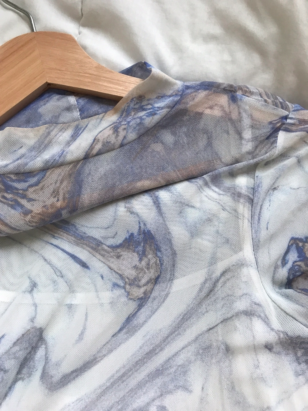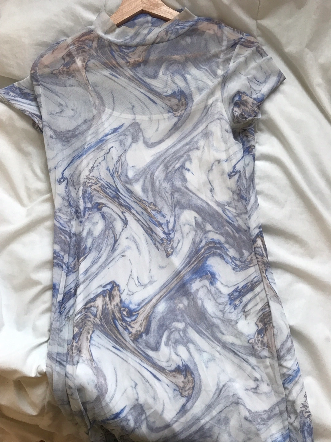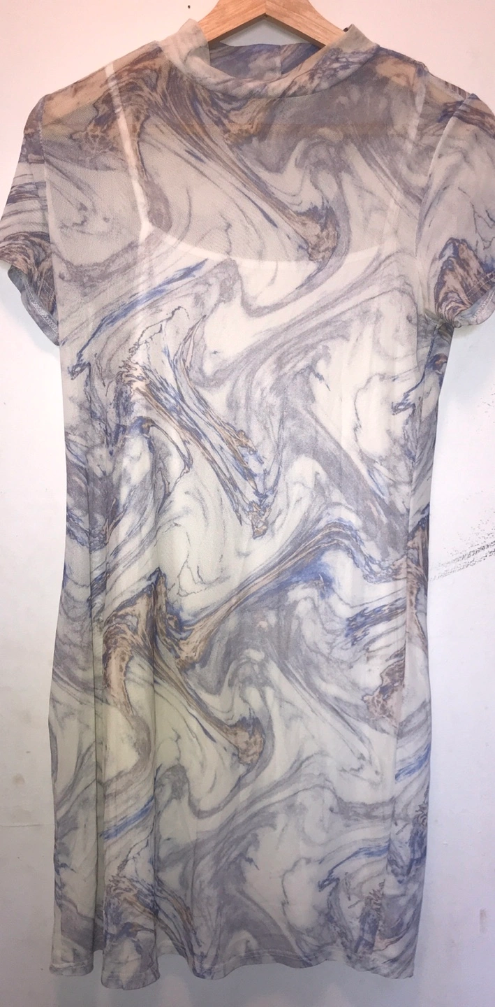 Here's a super cute mesh dress with a unique marble print! It's perfect for layering or wearing on its own for a fun, trendy look.