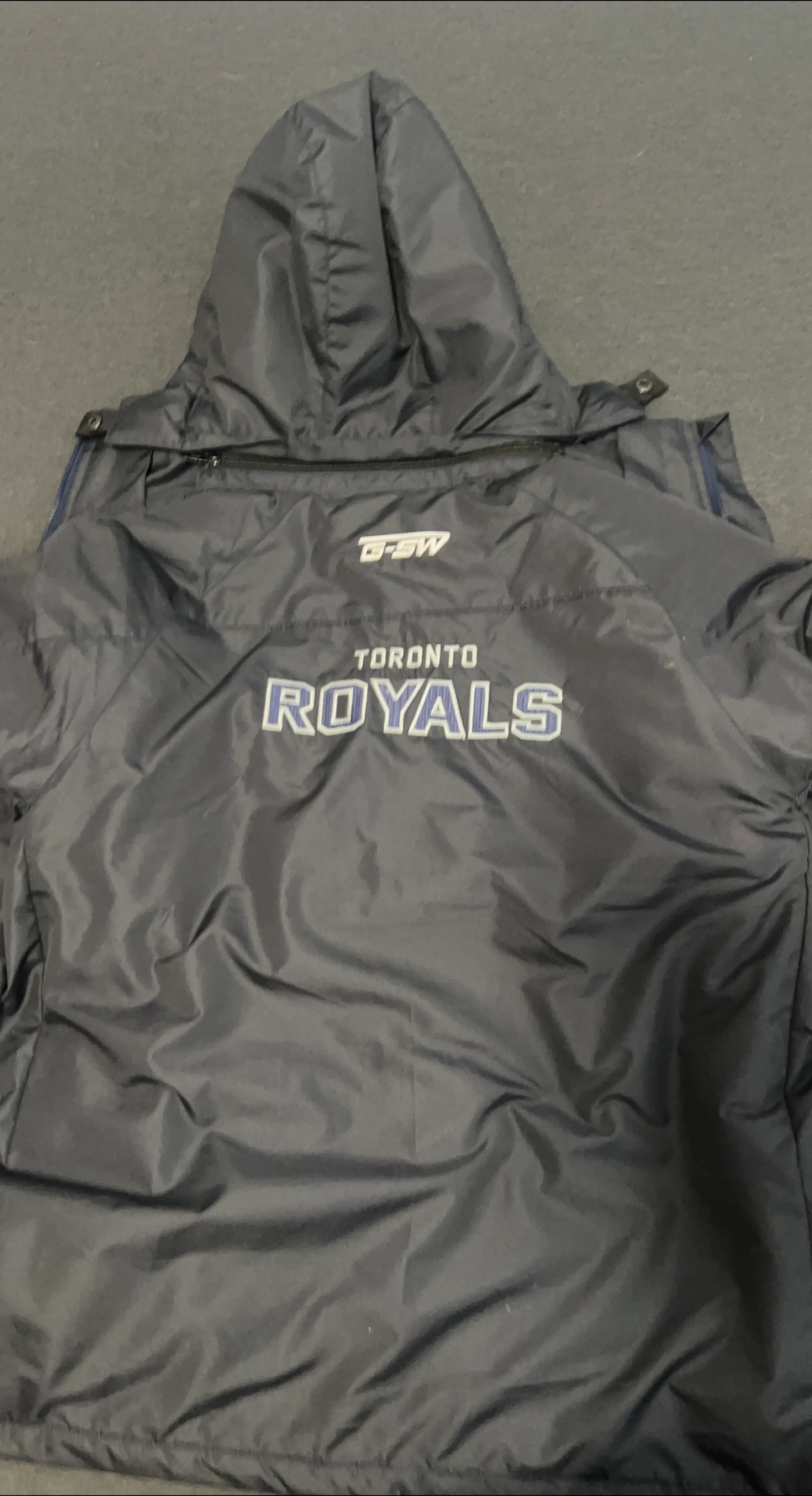 Selling a G-SW Toronto Royals jacket in size small. It's in great condition and perfect for showing your team spirit! The jacket is navy blue and features the Toronto Royals logo on the back. The size is a small. Men’s jacket