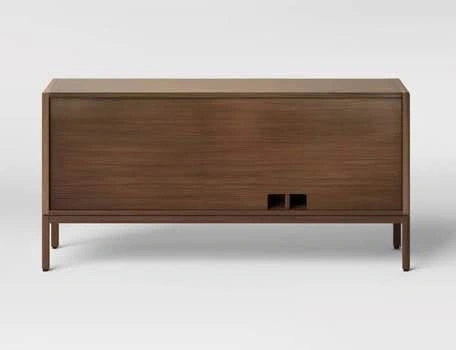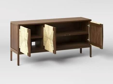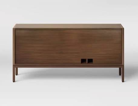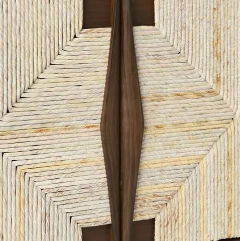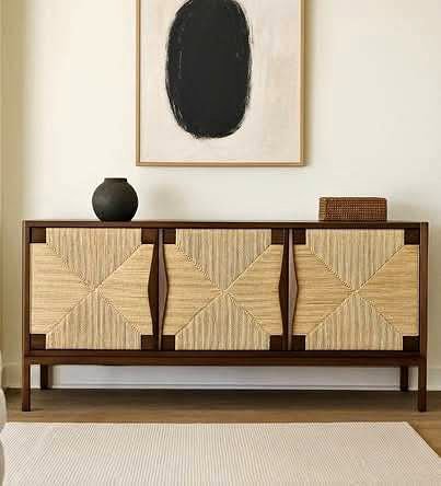 Wood media stand with woven rope doors. Can be used as a TV stand or as a sideboard/console.