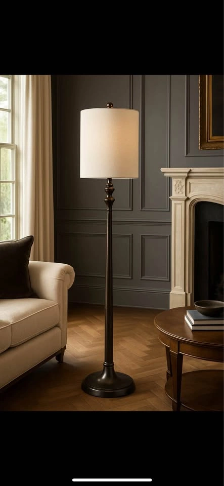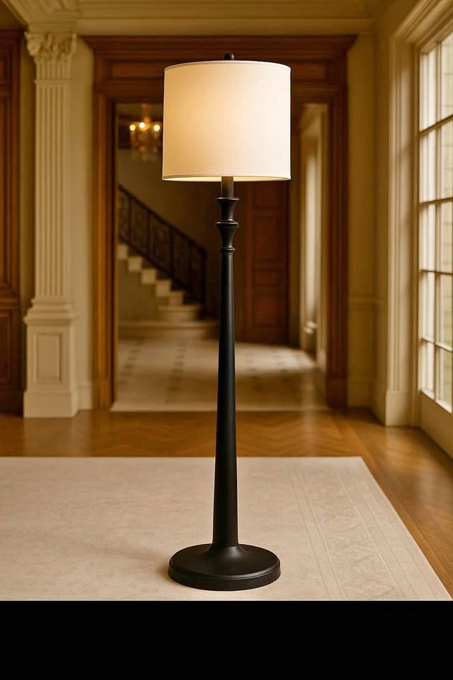 Elevate your home with this elegant 64” floor lamp, featuring a black painted resin body and a beige linen shade for a timeless look.