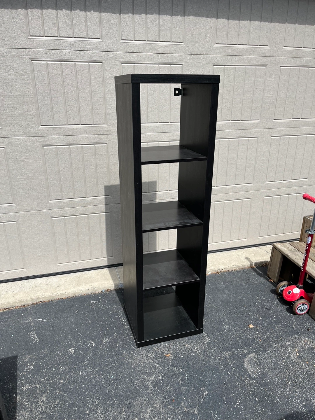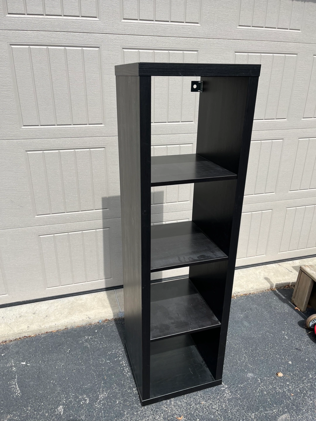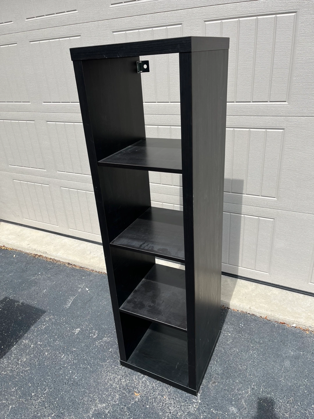 Here's a handy black bookcase with four shelves! It's perfect for storing books, displaying decorative items, or organizing your space. This unit is in good condition and ready for a new home