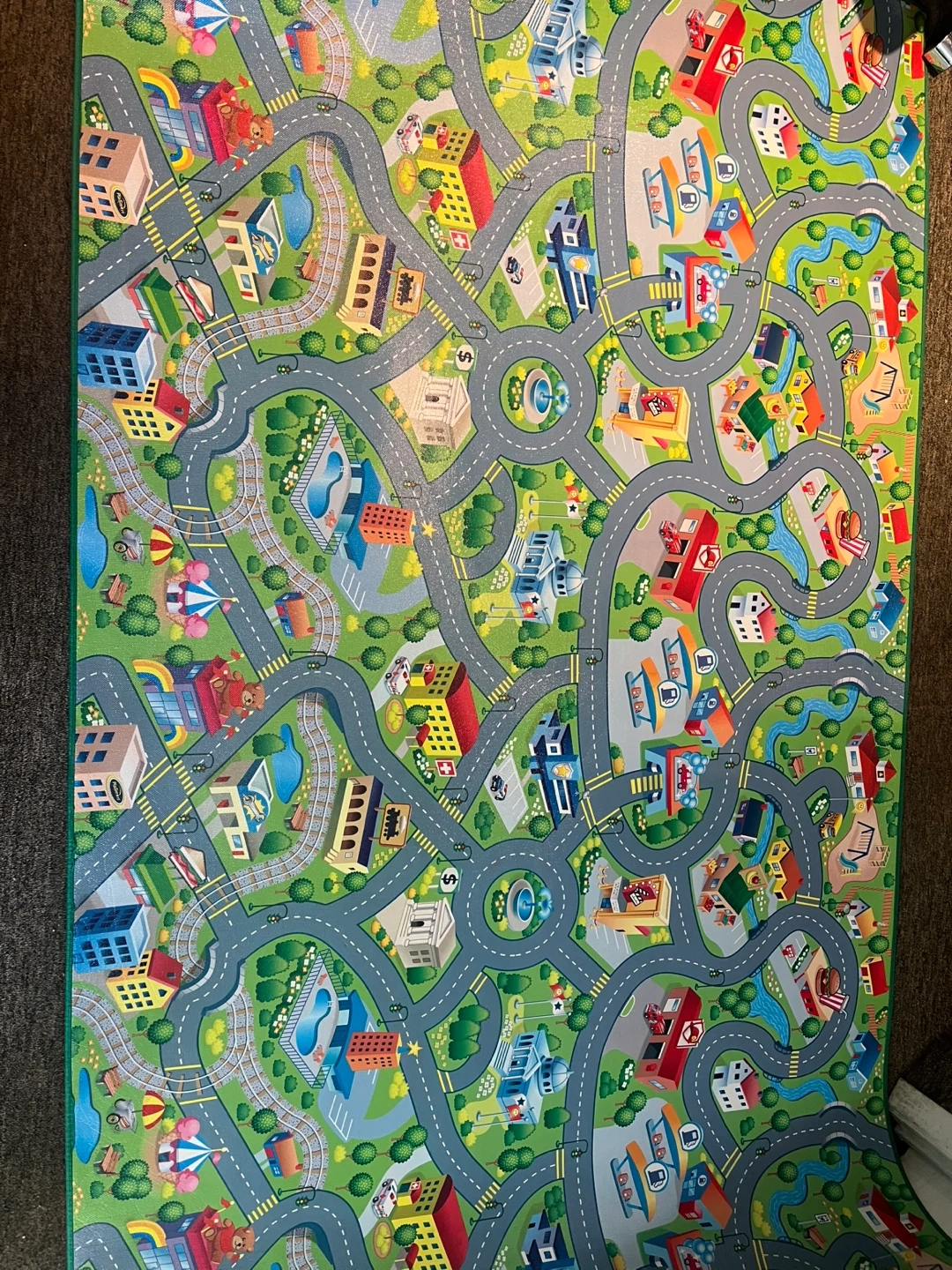 This is a gently used play mat featuring a city life design. It's perfect for kids who love cars and imaginative play! The mat is colourful and engaging, with roads, buildings, and other city elements to spark creativity