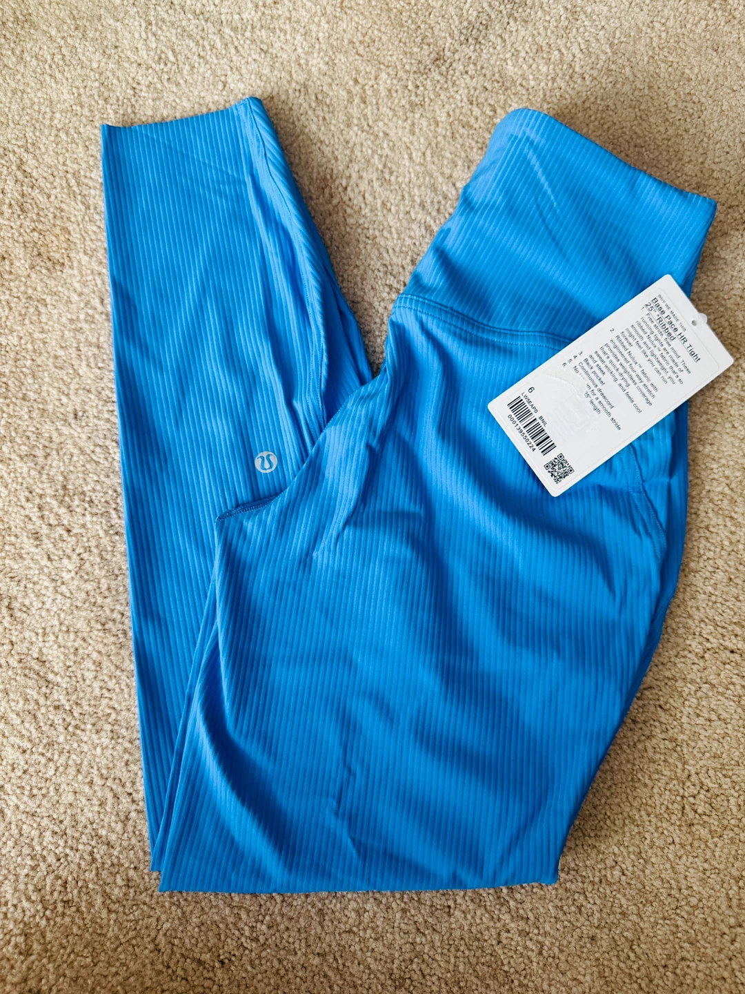 Selling a pair of Lululemon Base Pace HR Tight 25" Ribbed leggings in size 6! These are made with ribbed Nulux fabric, known for being smooth and lightweight, perfect for running or any activity. The fabric is quick-drying, sweat-wicking, and feels cool and sleek. They feature a back pocket and a continuous drawcord for a smooth stride.
