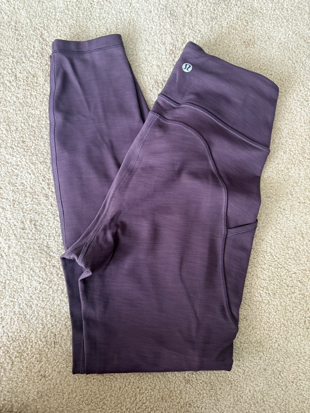 Selling a pair of Lululemon leggings in a lovely shade of purple. They appear to be in great condition and ready for a new home. Perfect for yoga, running, or just lounging around!