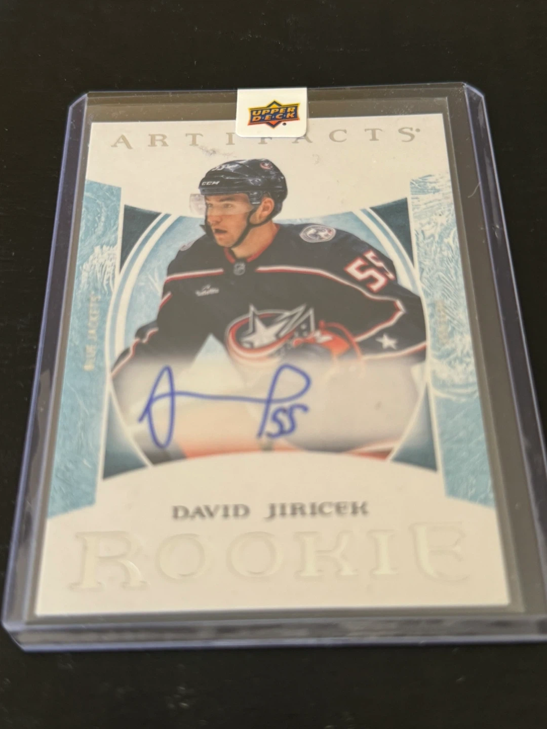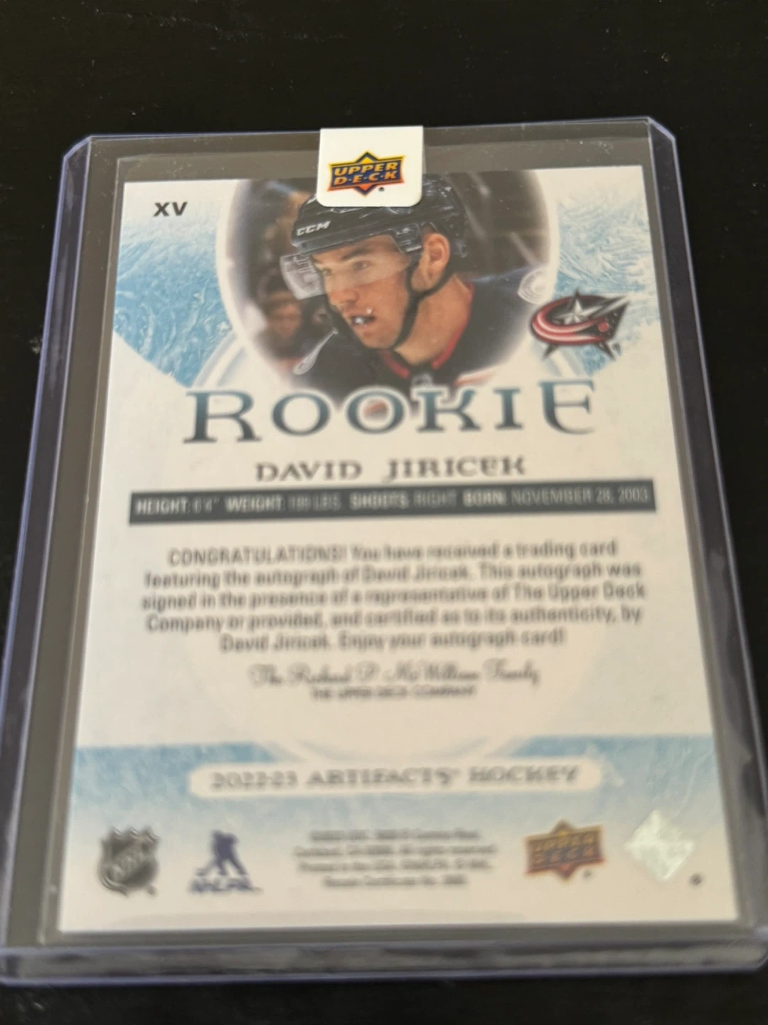 Selling a David Jiricek autographed rookie card from the 2022-23 Artifacts Hockey series. It features his autograph and details such as his height (6'4") and weight (198 lbs). A great addition for any hockey card collector!