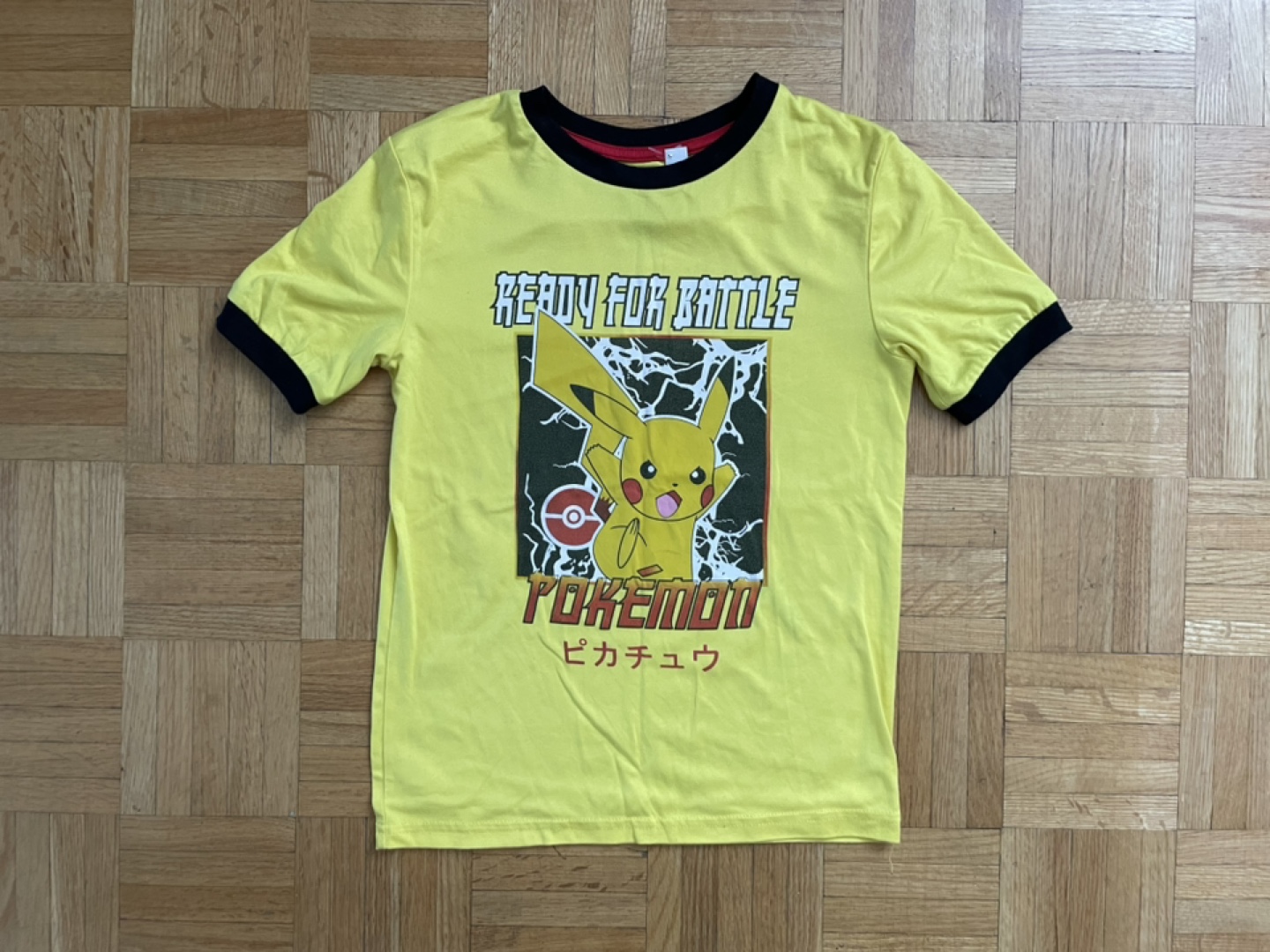 A fun yellow t-shirt featuring Pikachu from Pokémon! The shirt has black trim around the neck and sleeves. Great for any Pokémon fan!