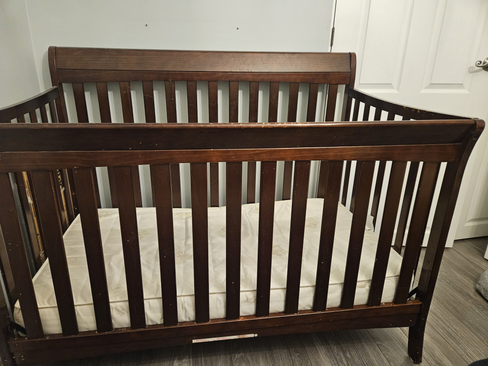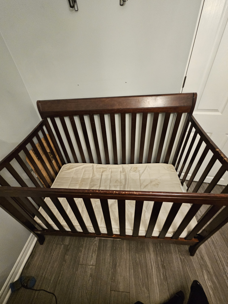 Selling a dark wood baby crib. It's sturdy and ready for a new home. Perfect for creating a cozy and safe sleeping space for your little one! Mattress included. Everything is disassembled .