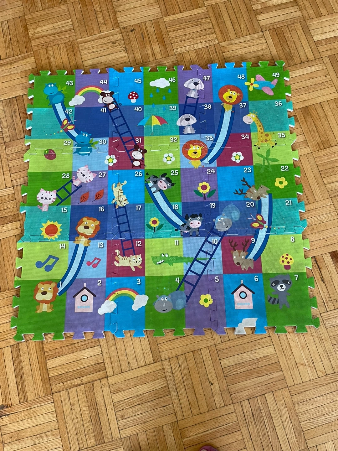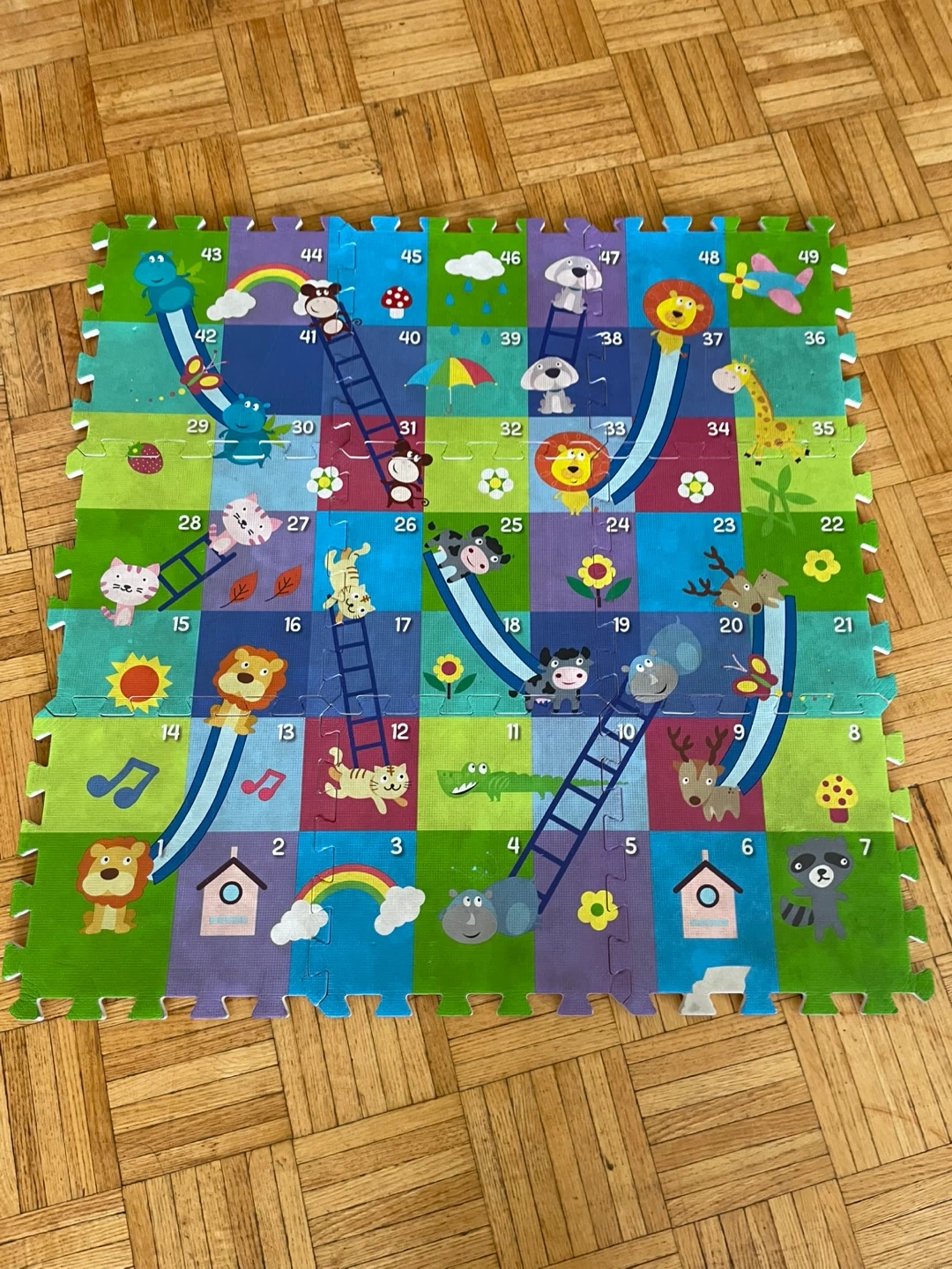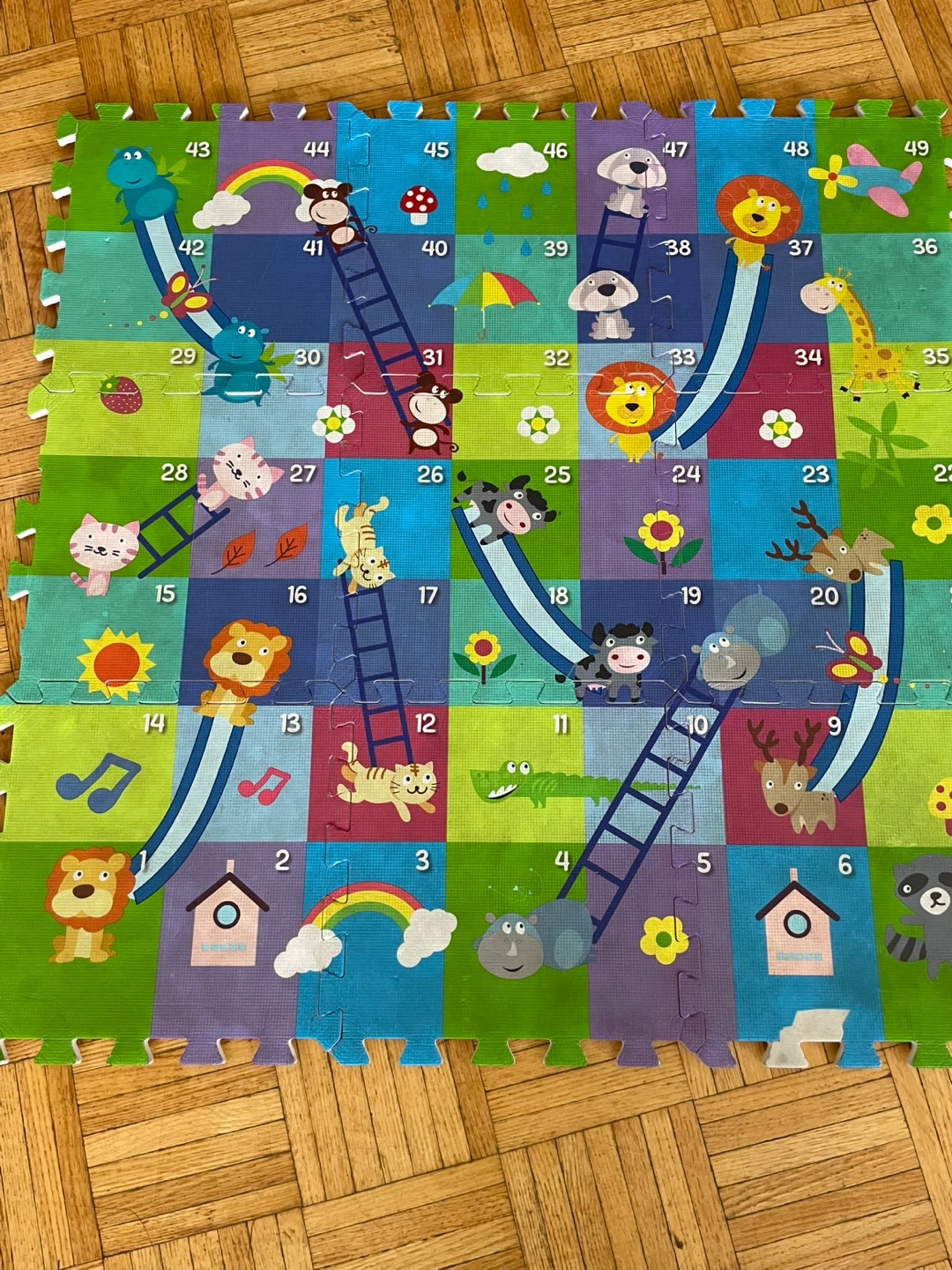 A colourful foam play mat for kids! Features a fun snakes and ladders design with numbers and animals. Perfect for playtime and creating a soft surface for your little one