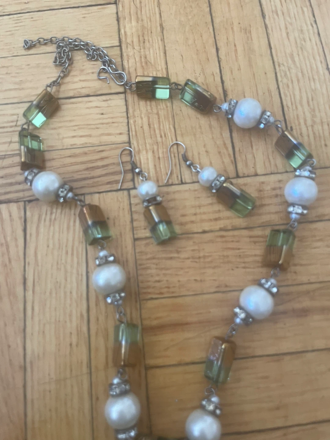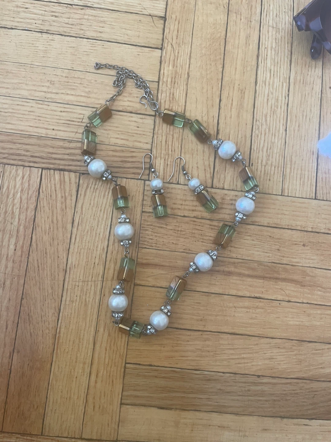 This is a lovely necklace and earring set. The necklace features a silver chain with a mix of pearl-like beads and green and brown rectangular beads. The matching earrings have a similar design, combining pearl-like beads with smaller green and brown rectangular beads. A beautiful set to add a touch of elegance to any outfit!