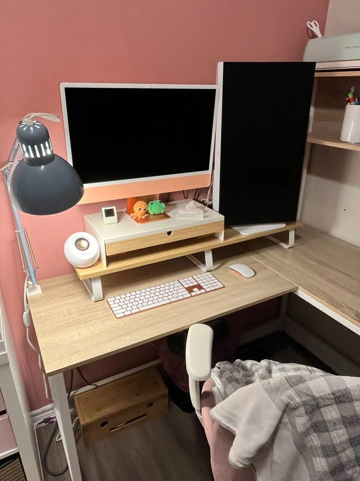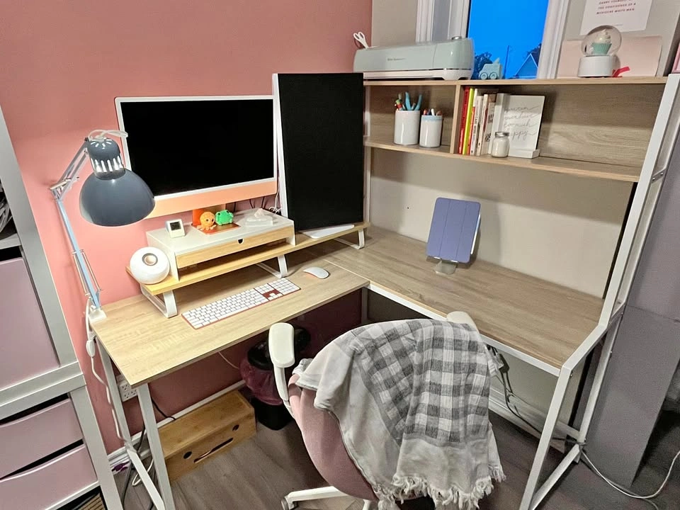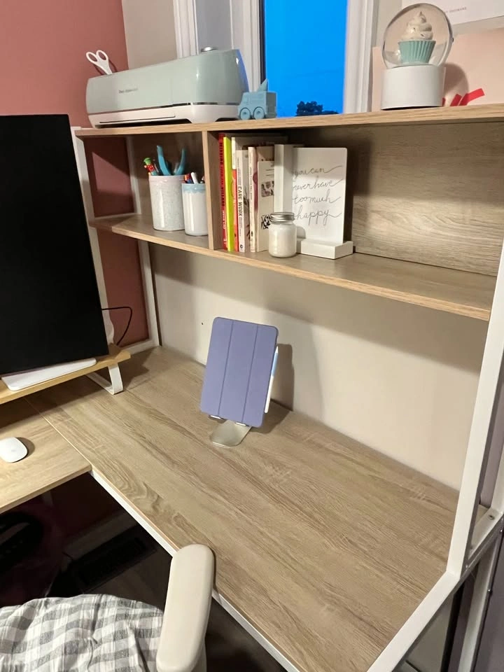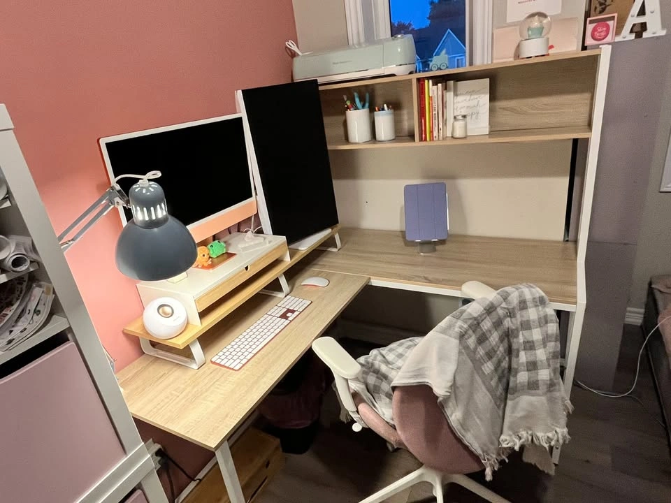 5I'm sad to let this desk go as I've had it for years, but I've decided to get a standing desk! This desk is in great condition with tons of space, including open storage. You can decide whether the storage shelves are on the right or the left. The desk will come disassembled. Selling for $200 or best offer. - Durable particleboard with steel frame, long-lasting and easy to clean - Sufficient arm space - Adjustable feet Specifications: Overall: 58.75'' H X 55'' W X 49.25'' D Shelf: 23.5'' W X 19.75'' D Overall Product Weight: 62.83 lb. Desktop Depth - Front to Back: 19.75'' D Desk Height - Top to Bottom: 29.5'' H