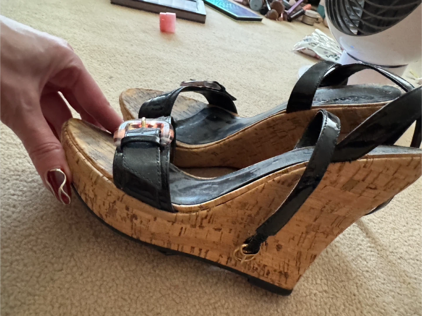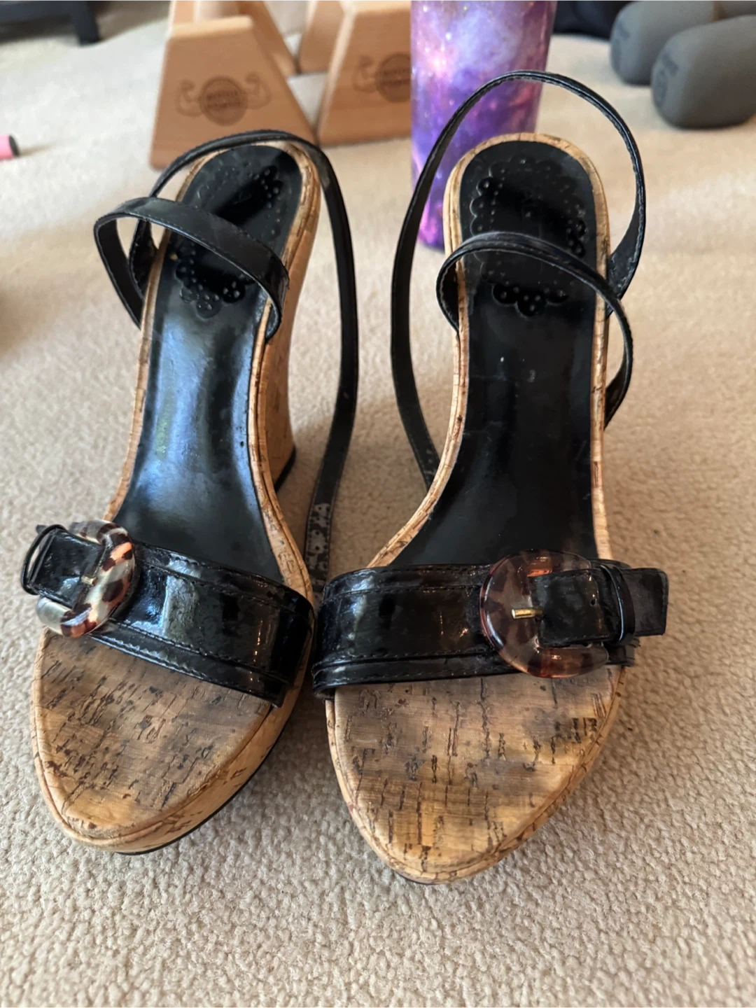 10Cute black wedge sandals with a cork platform. They feature patent leather straps and a tortoise shell buckle. Size 10 Used well but some life left $10