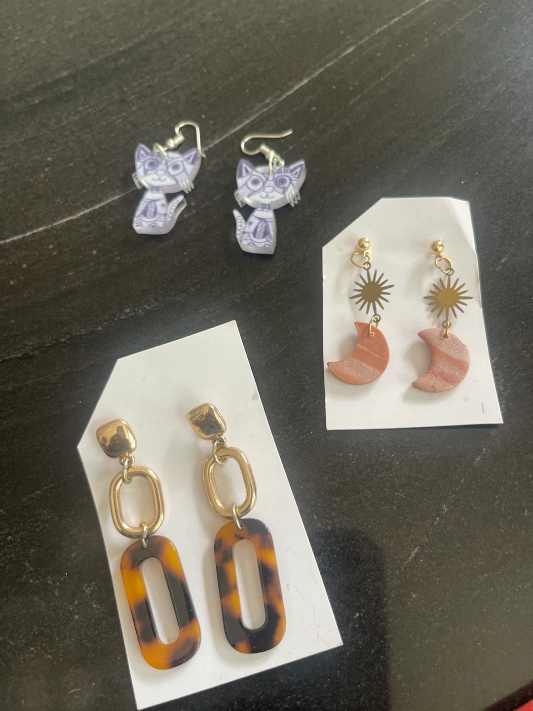 Selling a few pairs of earrings! There are cat earrings, moon and star earrings, and tortoise shell earrings. All are in great condition and ready for a new home Giftable ! Pick up keele and Bloor Cash please