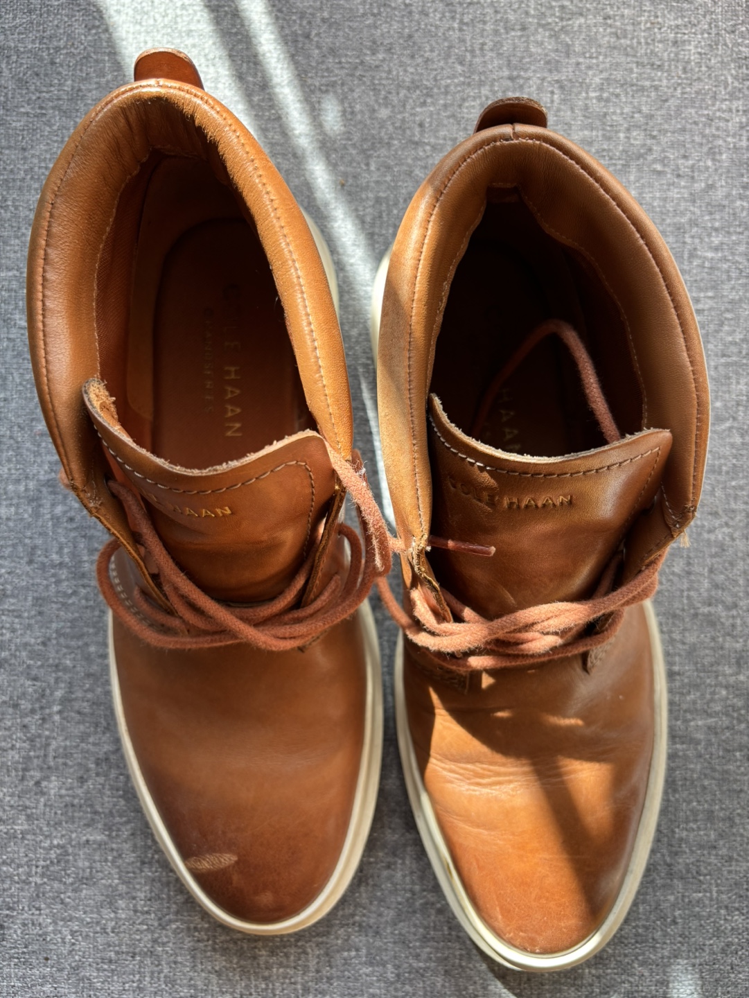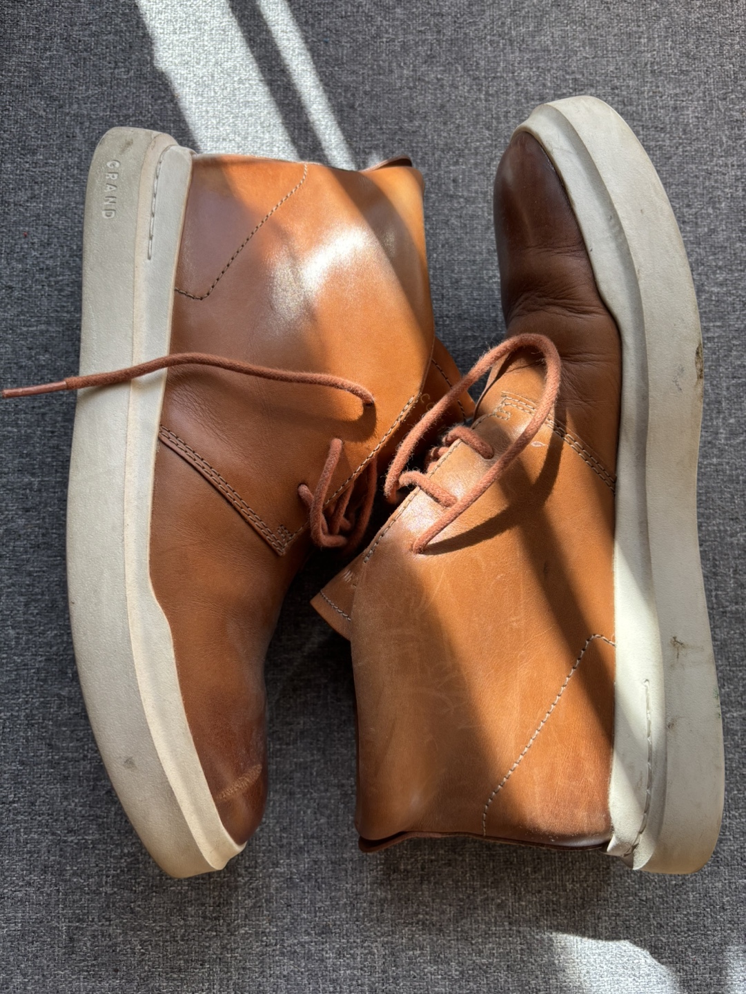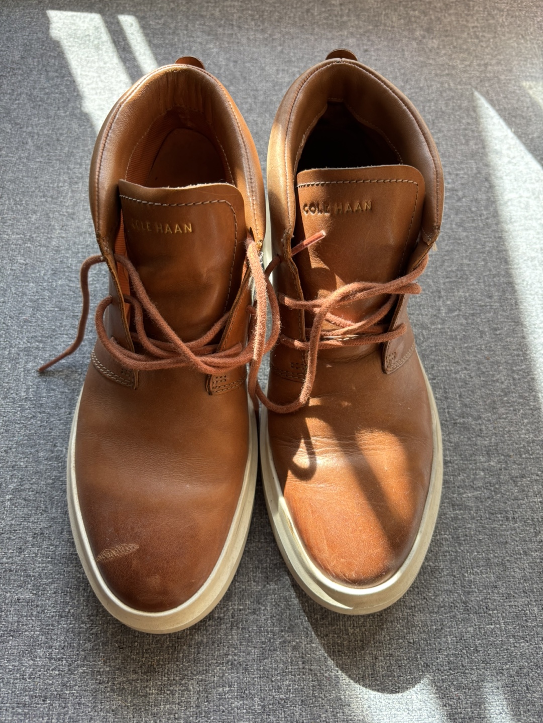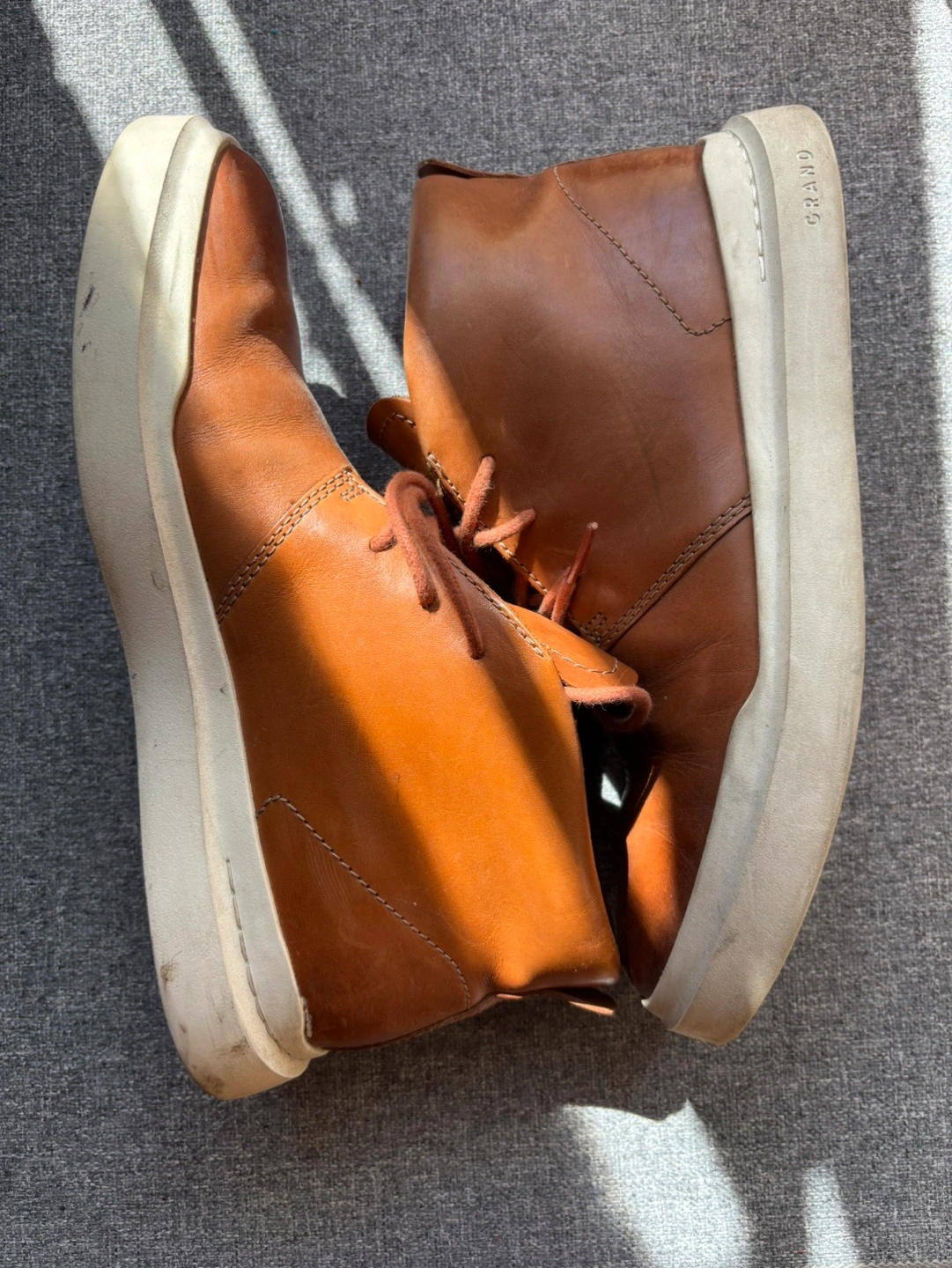 Selling a pair of Cole Haan leather chukka boots in a men's size 8M. These are a stylish and comfortable choice for everyday wear. They feature a classic design with a modern twist. The leather is in good condition, and the soles have plenty of life left. These boots are perfect for adding a touch of sophistication to your casual outfits!