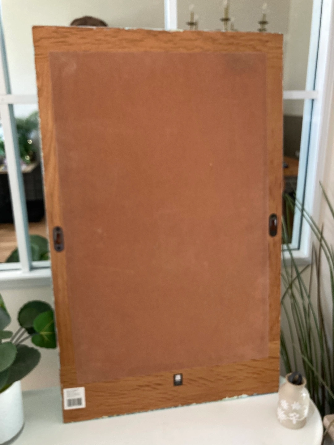 Hangs on a wall with 2 nails - See in photo. Or can lean it again the wall on a dresser for decor style.