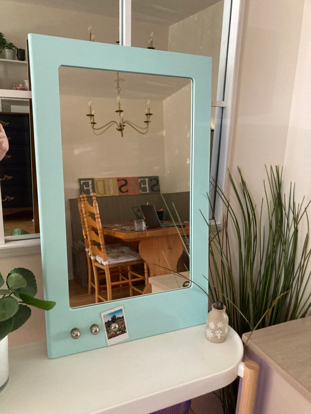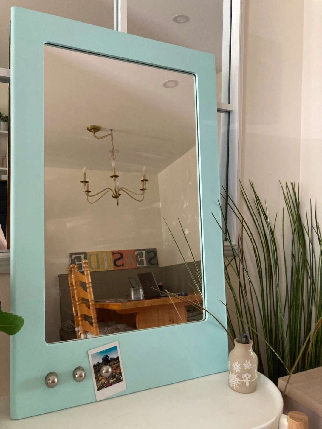 Cute accent mirror in pop of colour aqua. Bottom left includes 3 marble shaped magnets to hold Polaroids, jewelry etc. The magnets are very strong!