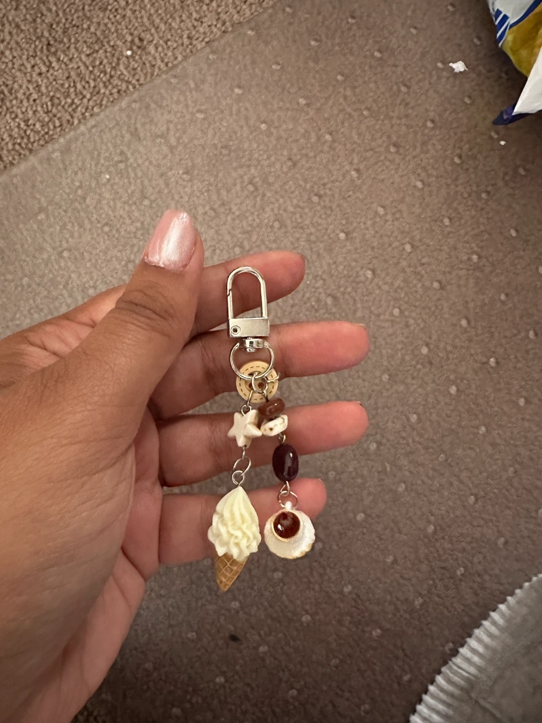 Selling a cute charm keychain. It features an ice cream cone, coffee cup, star, and beads. Perfect for adding a little fun to your keys or bag!