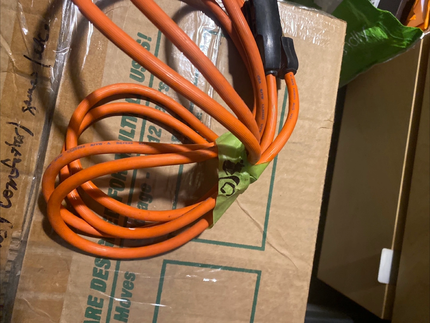 Selling an orange electrical extension cord. It's in good condition and ready for use! Recommend for indoor use. 10ft Moving Sale Pick up only