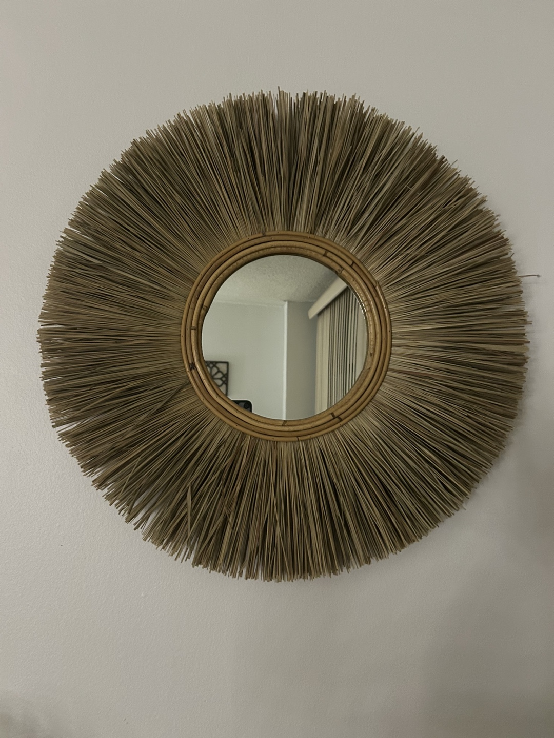 Selling a round mirror with a rattan frame! It's in great condition and would add a nice touch to any room. The natural materials give it a warm and inviting feel
