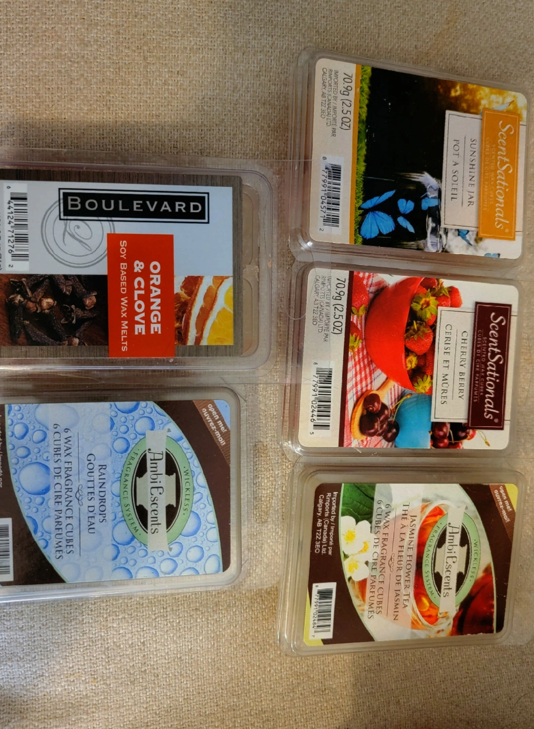 Selling a bundle of wax melts to freshen up your space! You'll get a mix of scents from ScentSationals & AmbiEscents. Included are Sunshine Jar, Cherry Berry, Raindrops, Jasmine Flower Tea, Boulevard Orange & Clove. Each package contains 6 cubes of wax melts.