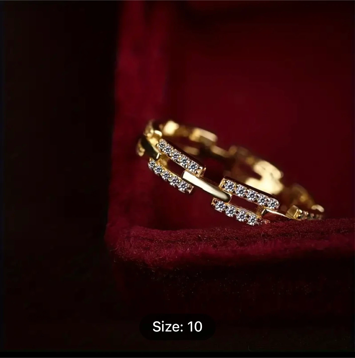 Selling a gold ring with sparkling gems and a unique chained design. Eye-catching yet elegant, it’s the perfect statement piece to add a little edge and shine to your jewelry collection.