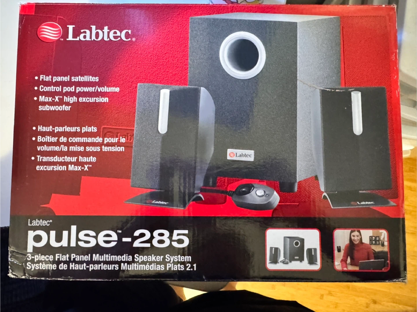 Selling a Labtec Pulse-285 3-piece flat panel multimedia speaker system. The box includes: