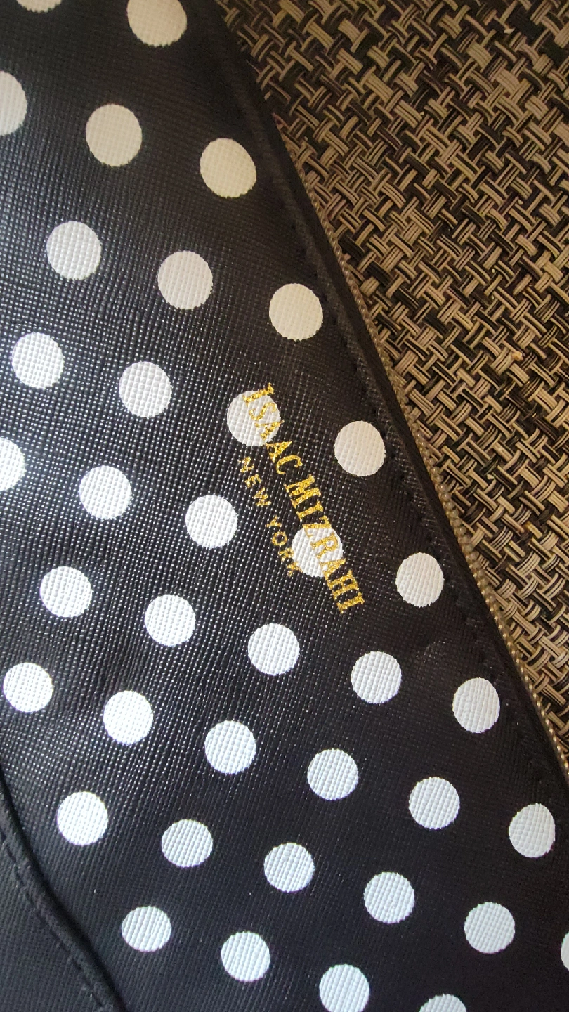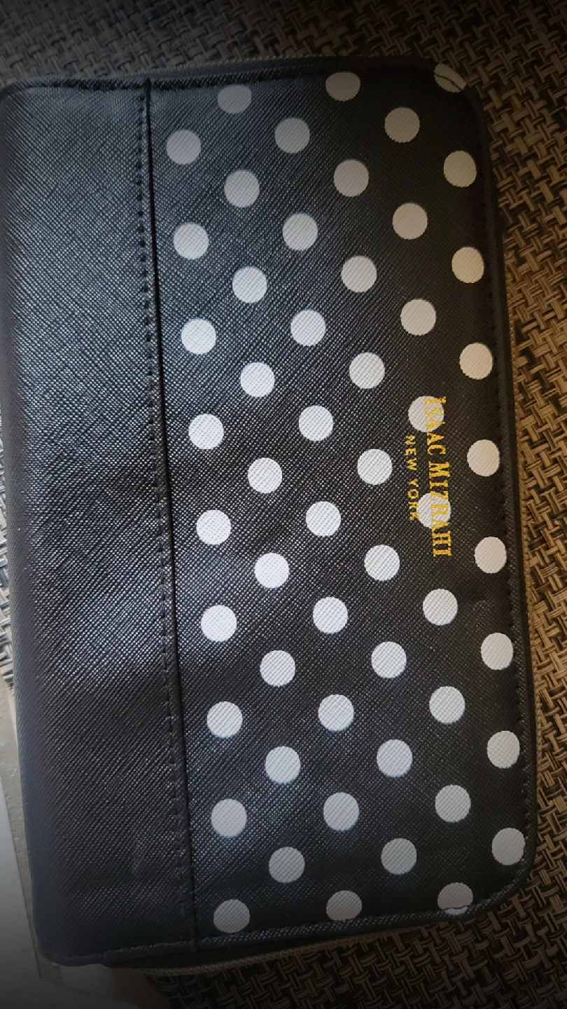 Cute Isaac Mizrahi cosmetic brush bag in black with white polka dots! It's in great shape and ready for a new home. Perfect for travel or everyday use to keep your makeup brushes etc organized