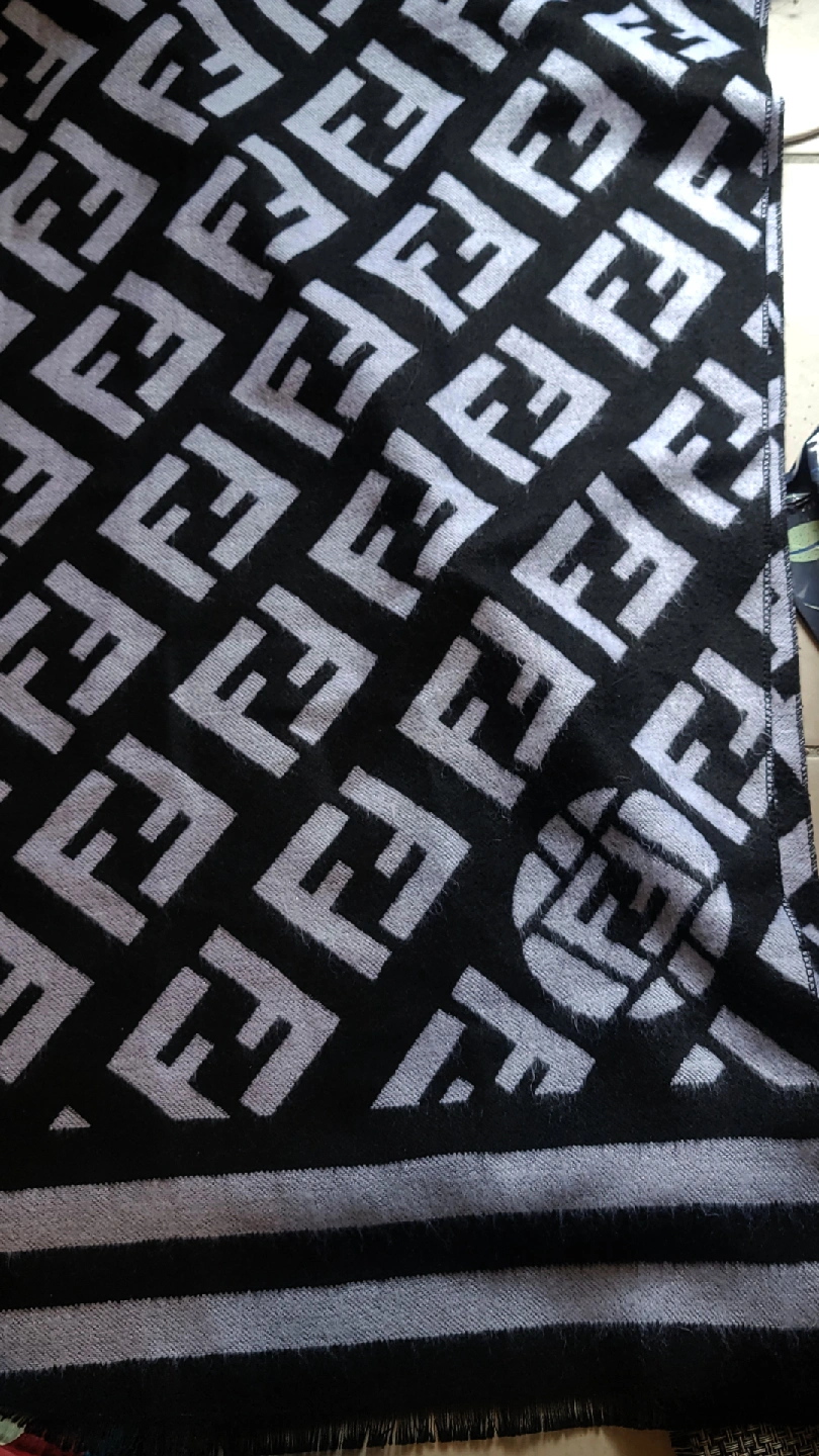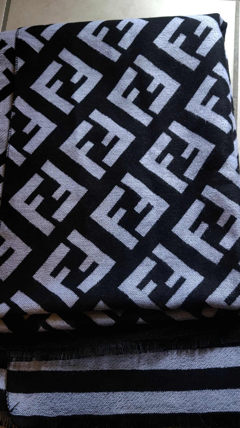 Stylish 80% wool super warm Fendi scarf in a classic black and grey colour scheme. Features the iconic logo pattern throughout. Perfect for adding a touch of luxury to any outfit this fall/winter season! (Large in width & length..can be used as a shawl too due to its large size)