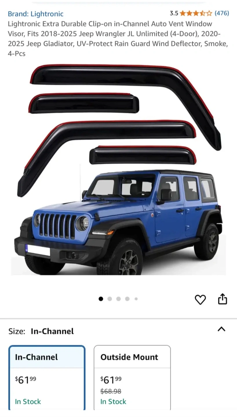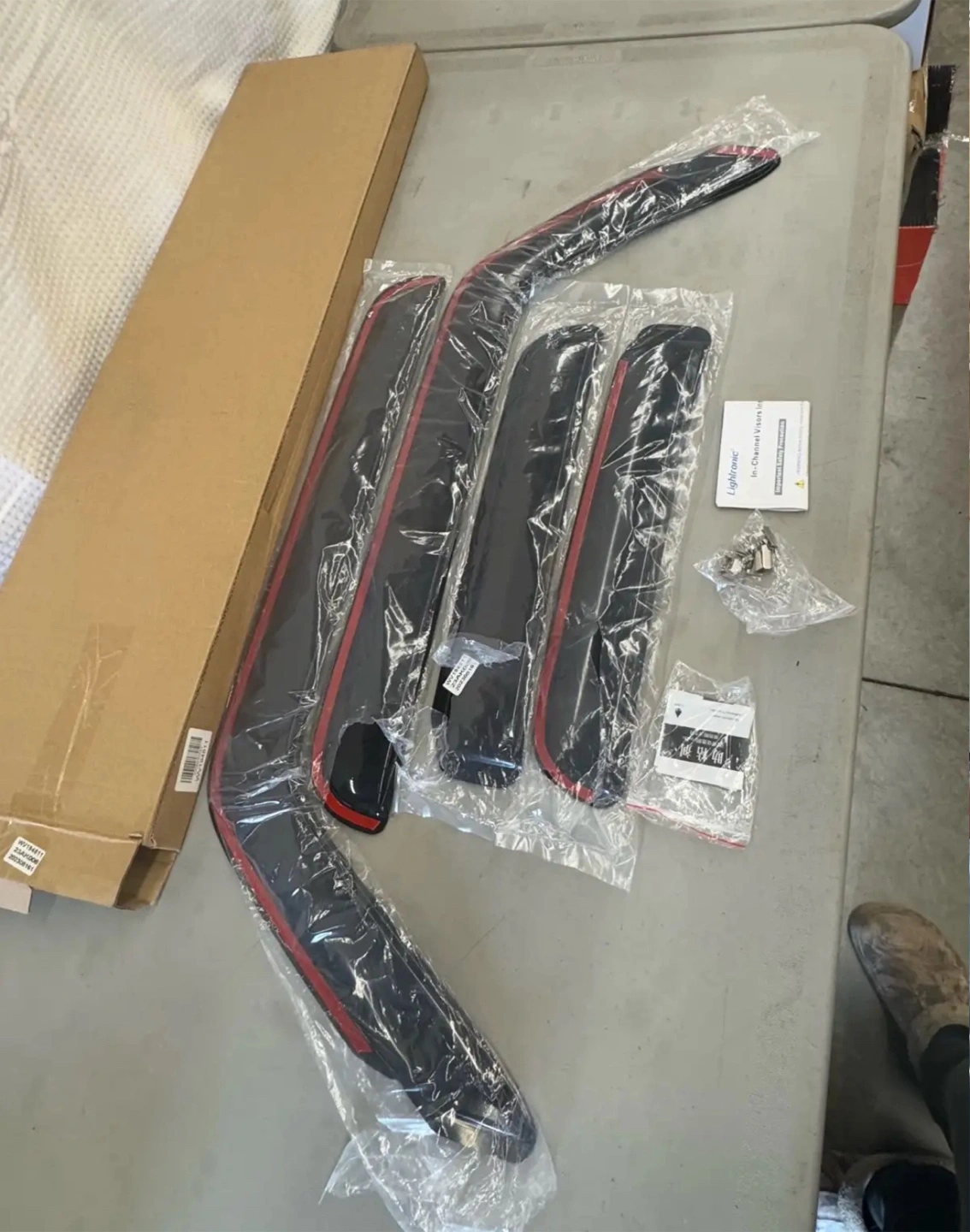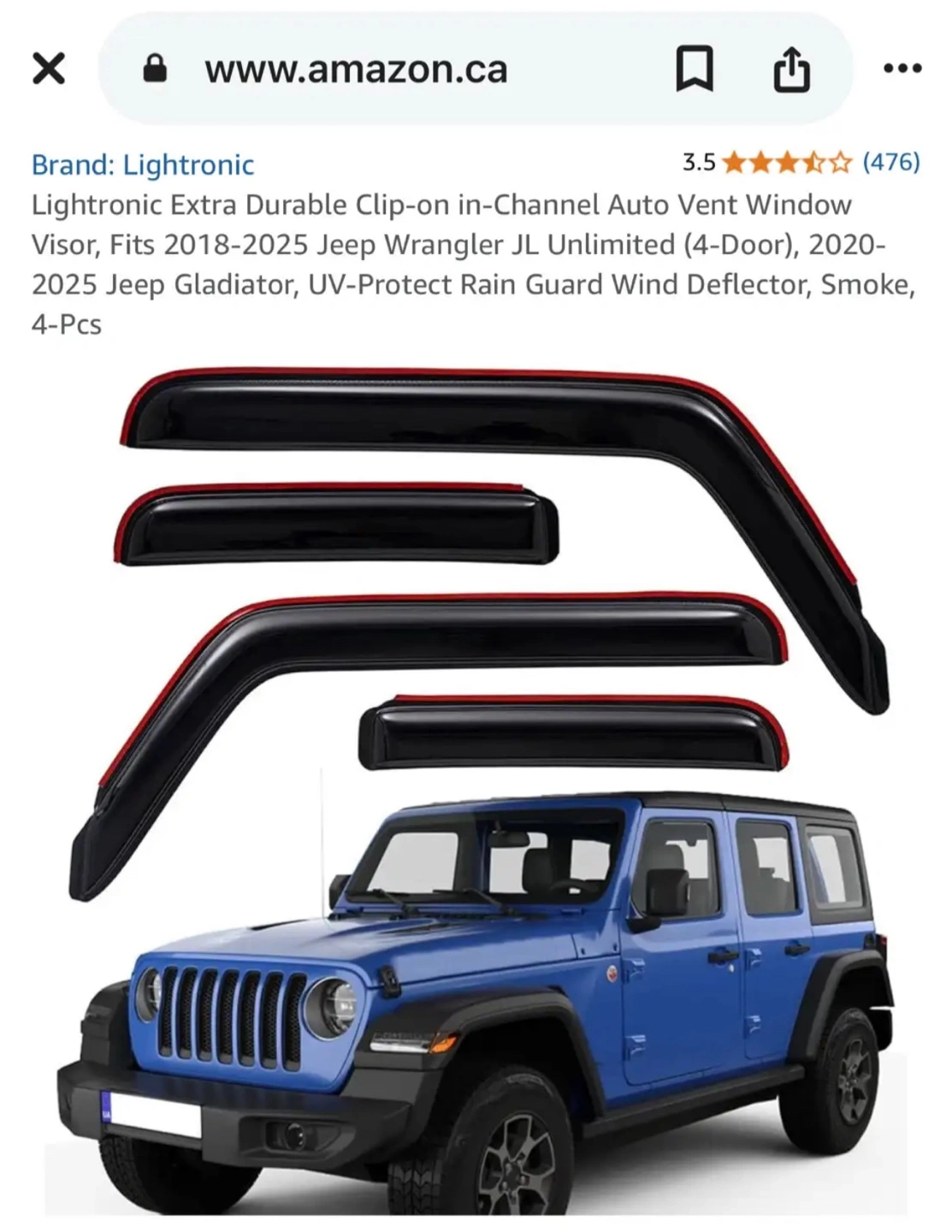 43Lightronic Extra Durable Clip-on in-Channel Auto Vent Window Visor, Fits 2018-2025 Jeep Wrangler JL Unlimited (4-Door), 2020-2025 Jeep Gladiator, UV-Protect Rain Guard Wind Deflector, Smoke, 4-Pcs Retails: $61.99 + tax **** 1 pieces needs new 3M tape **** See last photos can be bought at $1 Store Asking: $40 Brand new never installed In box and packaging opened for photos Pick Up Waterdown Area
