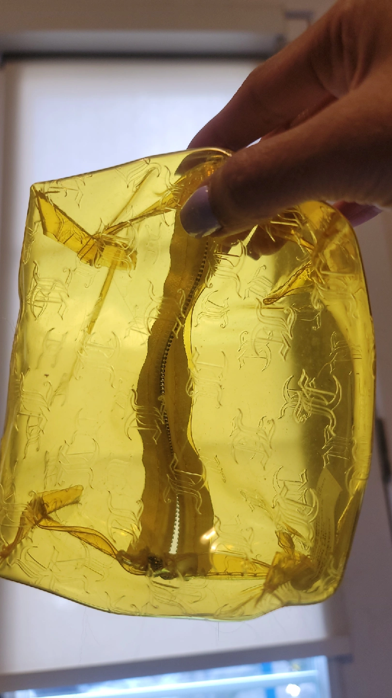 This is a cute yellow Juicy zippered pouch! It has a repeating design on it. Perfect for storing small items or cosmetics