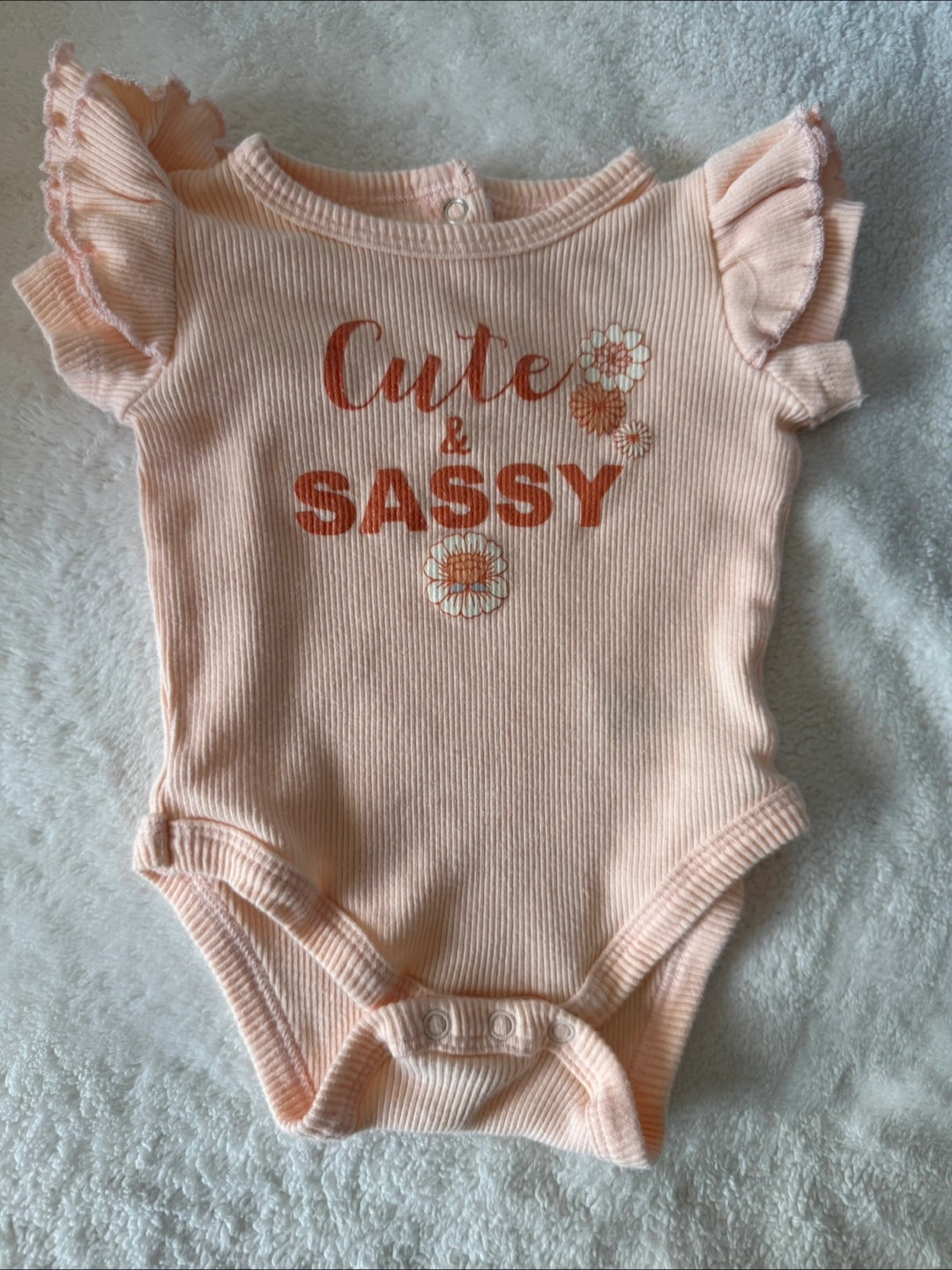 Super cute Catherine & Me baby onesie! It's in excellent condition and features adorable ruffle sleeves and a sweet "Cute & Sassy" design. Size is 3-6M. Perfect for your little one!