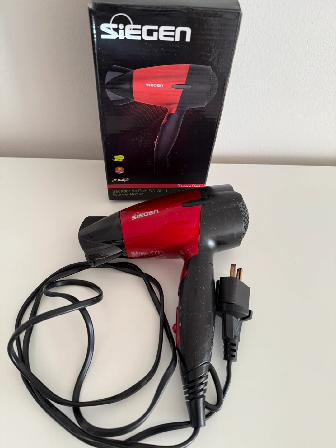 Selling a Siegen SG-3011 hair dryer! It comes with its original box. Key features: - 1400 Watt power - Bi-voltage - Easy to transport - Foldable handle - Ergonomic and ultra-light design - 2 speed and temperature levels - 1.75 meters of cable with hanging loop
