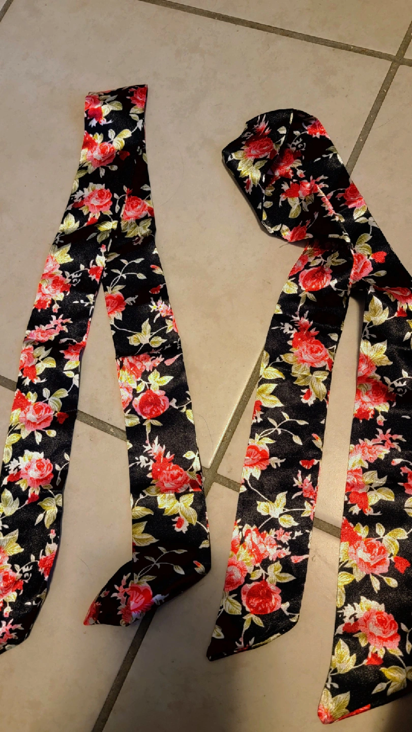 Pair of floral designed silky twillys. It's perfect for adding a touch of style to any outfit or hairstyle. Can be used in so many ways, as a hair/neck scarf accessory, tied onto your purse to add a little extra cute detail or even wrapped around the purse handles etc for a fashion fwd look!