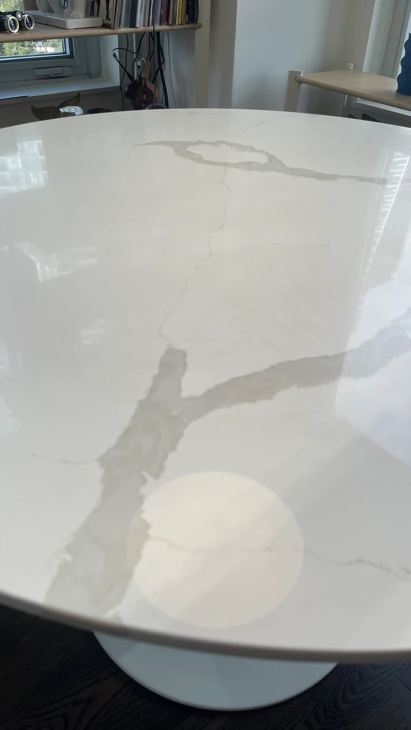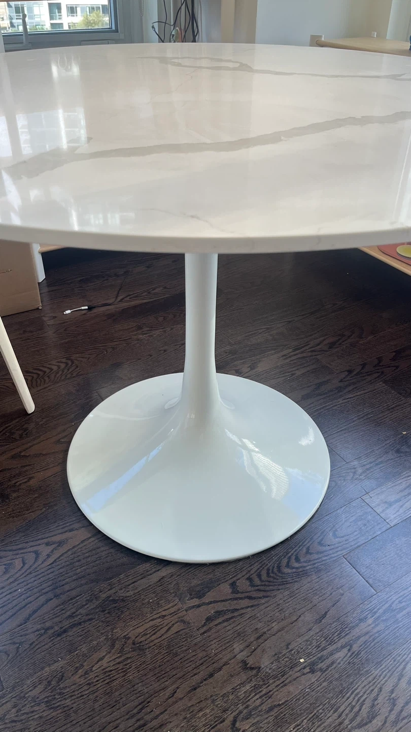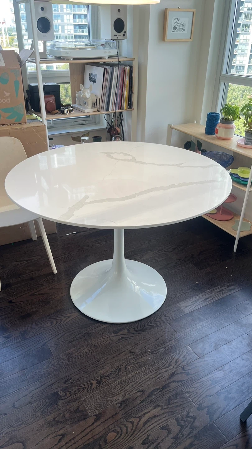 Add a touch of modern elegance to your dining area with this striking white tulip table. Featuring a sleek, minimalist design with a faux marble top and a sturdy tulip base, this table comfortably seats four people. It's the perfect centrepiece for intimate dinners or lively gatherings. Key Features: - Shape: Round - 44 inch - 112cm diameter - Colour: White with faux marble top - Seating Capacity: 4 - Style: Modern, minimalist This table has been well-maintained and is in good condition. Original price was 1000 dollars