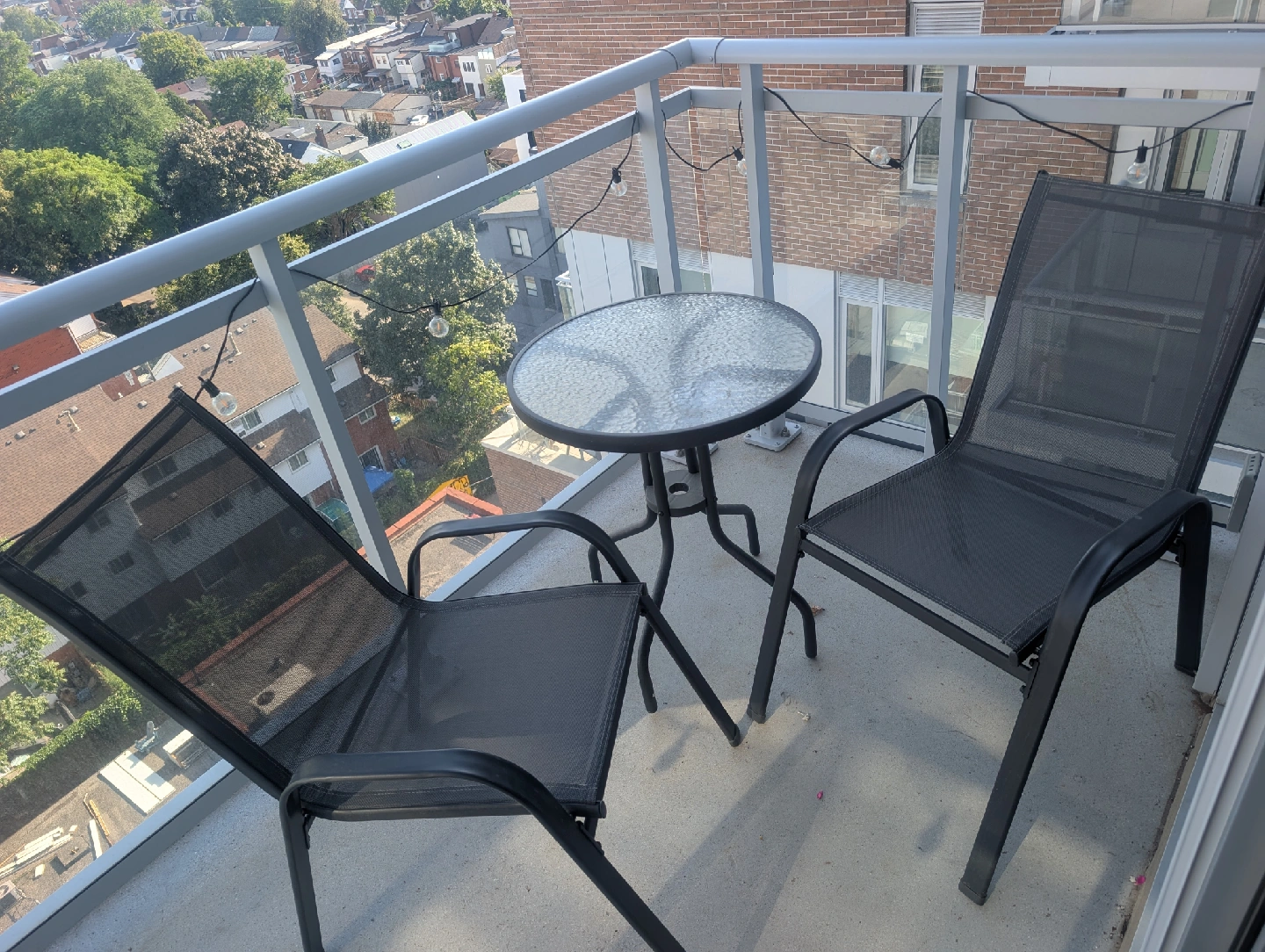 Selling a gently used outdoor patio set, perfect for a small balcony or patio! The set includes a round glass-topped table and two comfortable chairs.