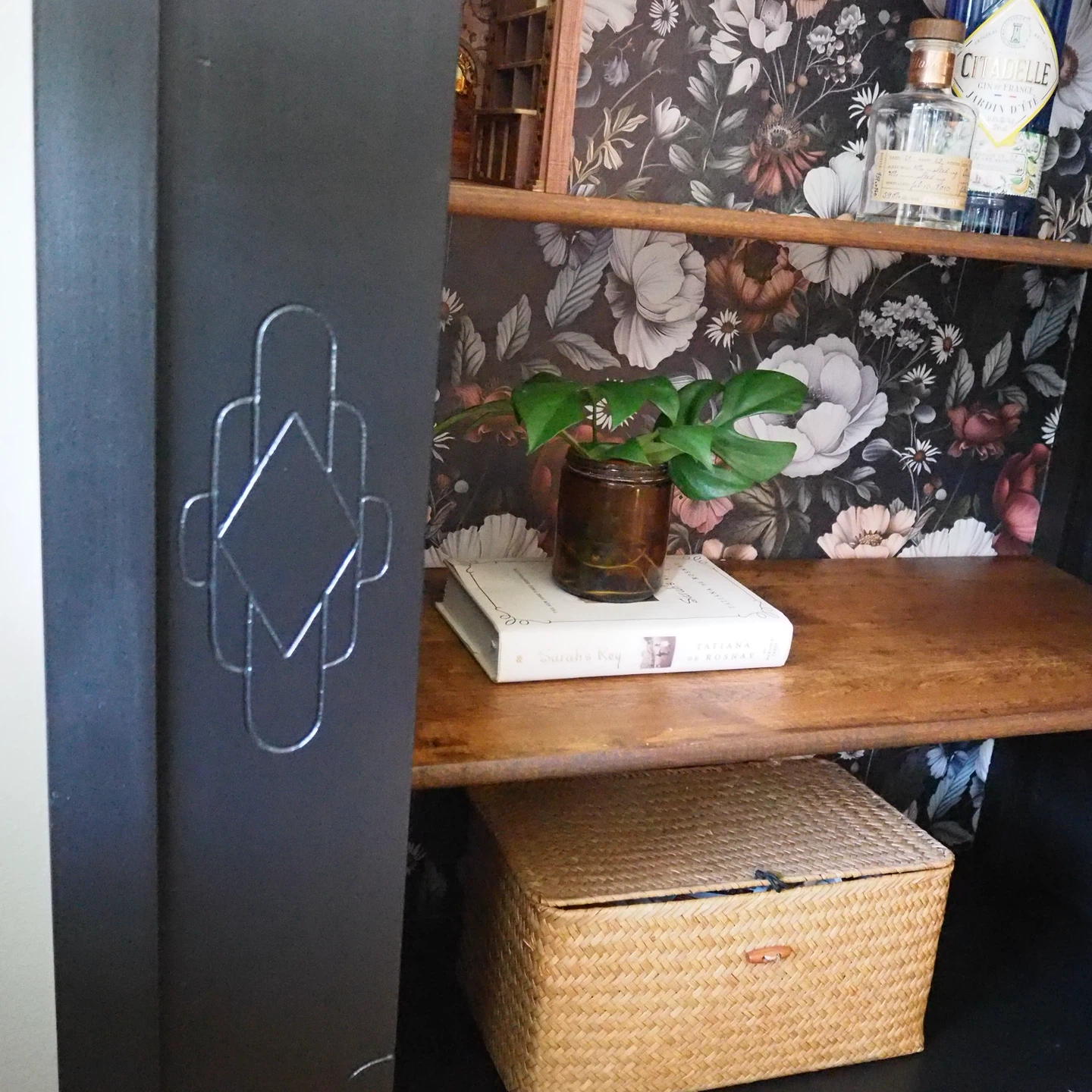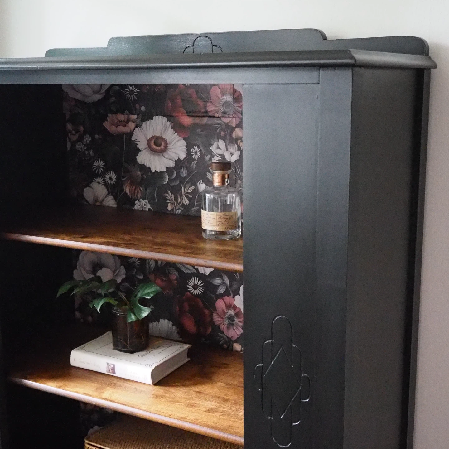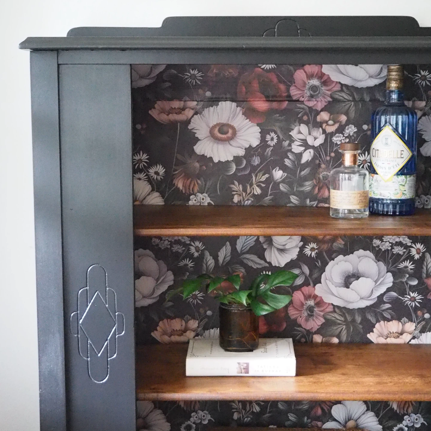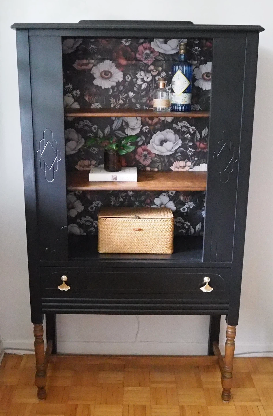 - Shelf Interior and drawer lined with dark floral wallpaper for that bold, moody look