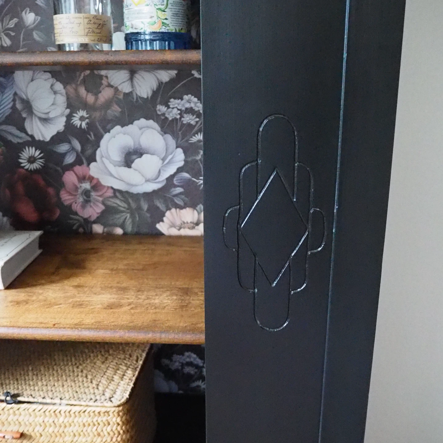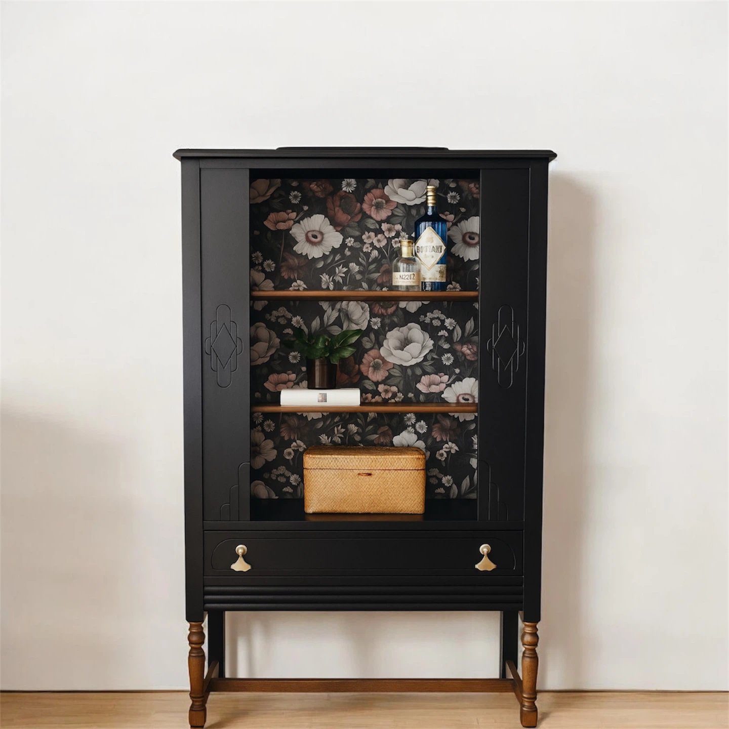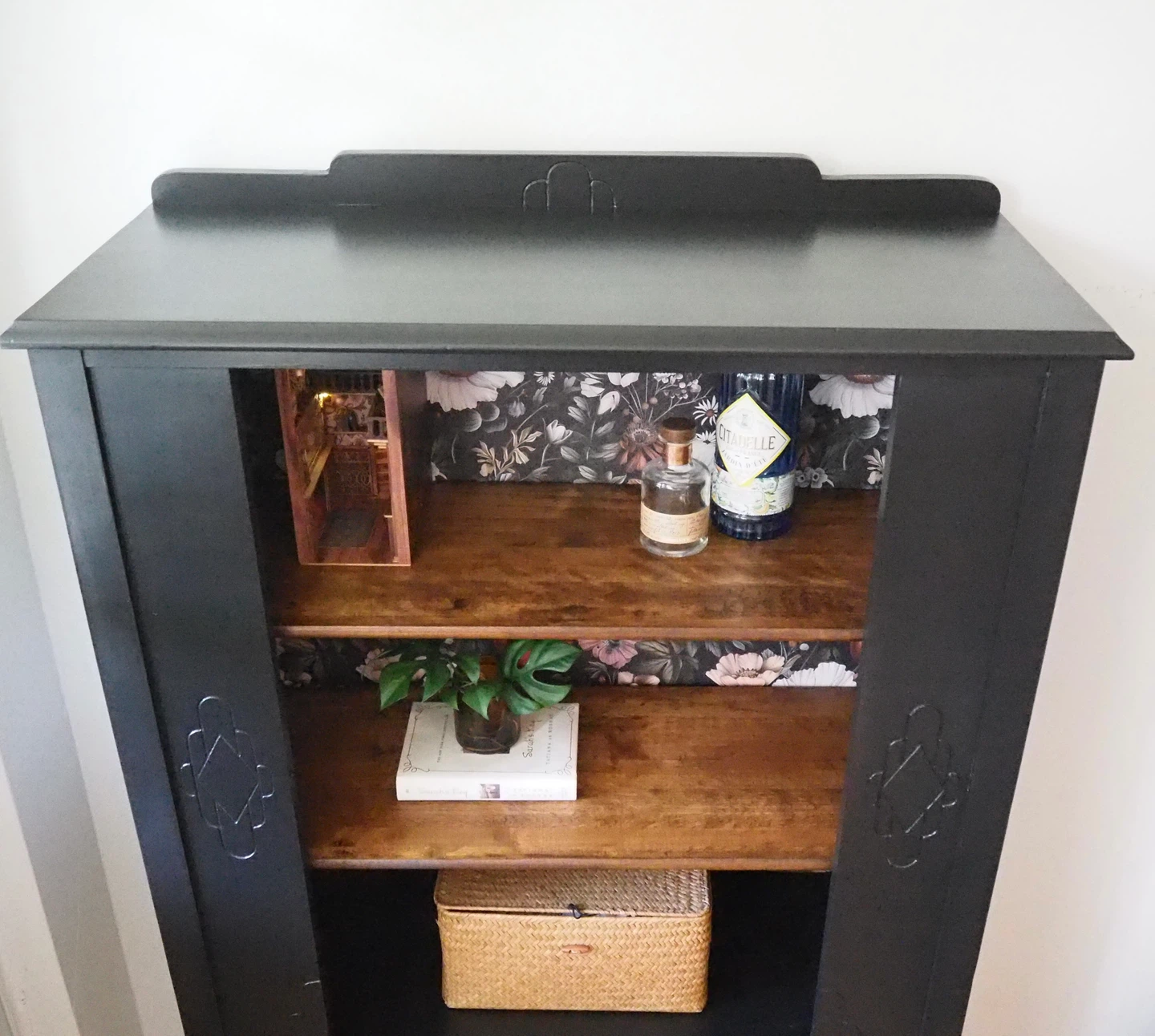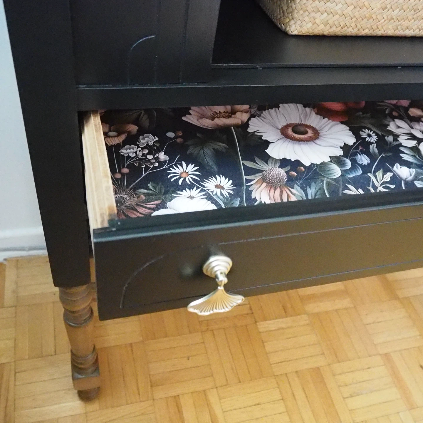 - Shelf Interior and drawer lined with dark floral wallpaper for that bold, moody look