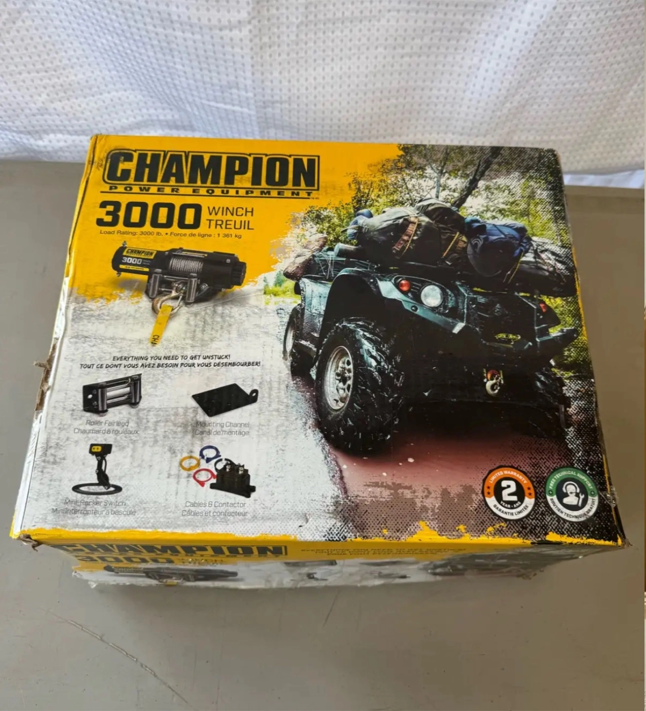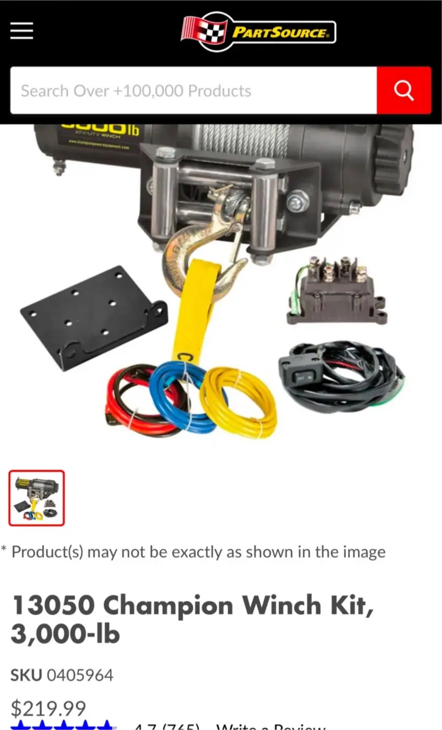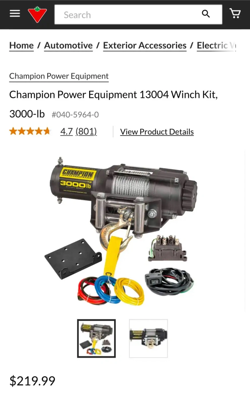 4313050 Champion Winch Kit, 3,000-lb Champion Winch Kit features a 3,000-lb (1360.7 kg) rated line pull Features a Permanent Magnet 1.3 hp (1 kW), 12V DC motor 3/16" x 45.9' (0.47 cm x 14 m) Galvanized steel aircraft cable with snap hook 171:1 gear reduction ratio Mountable rocker switch allows for easy operation Includes a flat bed mounting channel that allows for easy installation on your ATV or UTV Also includes a roller fairlead, power contactor, clevis hook and a cam action, free spooling clutch Retail PartSource: $219.99 + tax Canadian Tire: $219.99 + tax Asking: $160 Brand new never installed Comes in box and packaging opened for photos Pick Up Waterdown Area