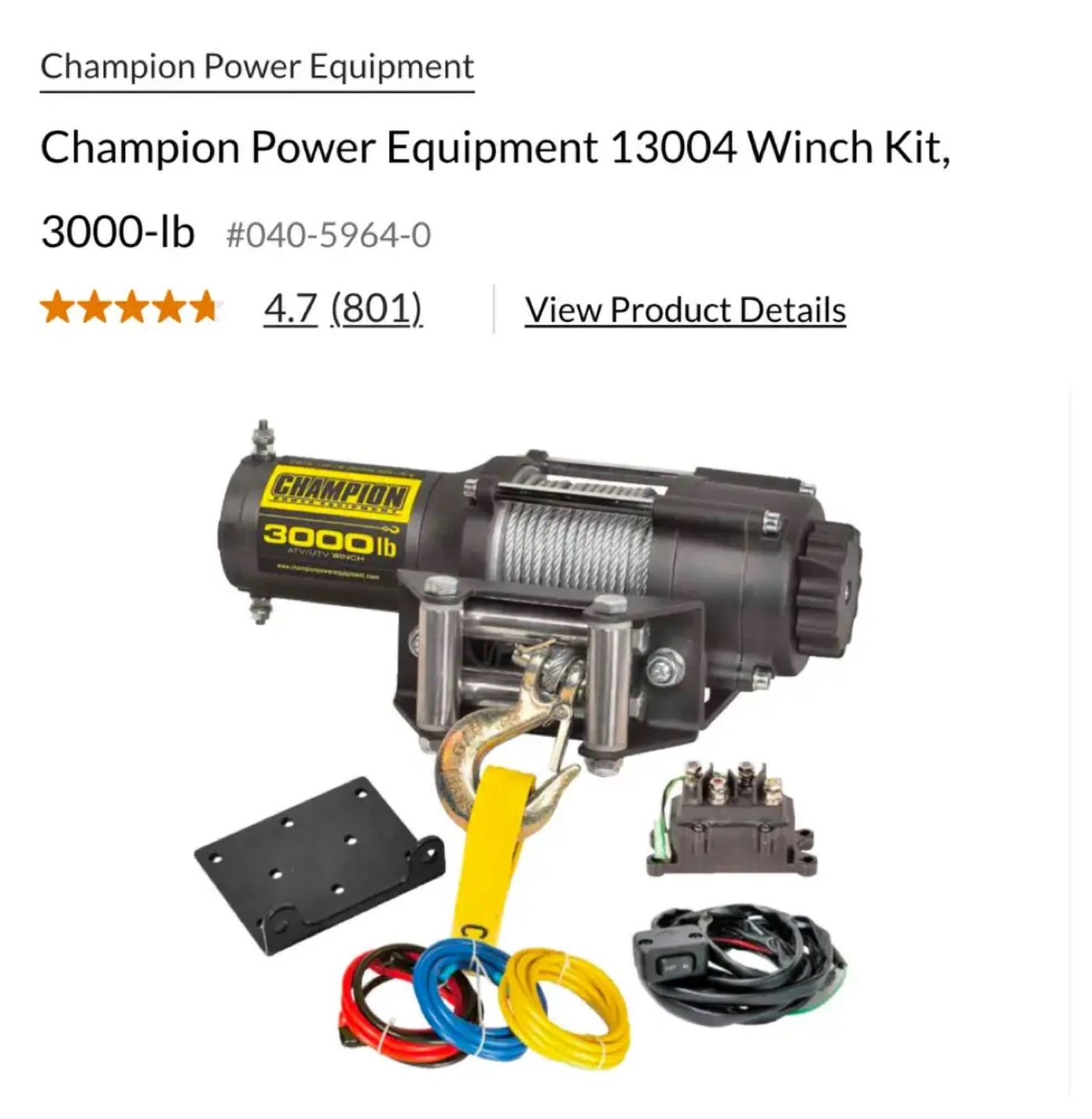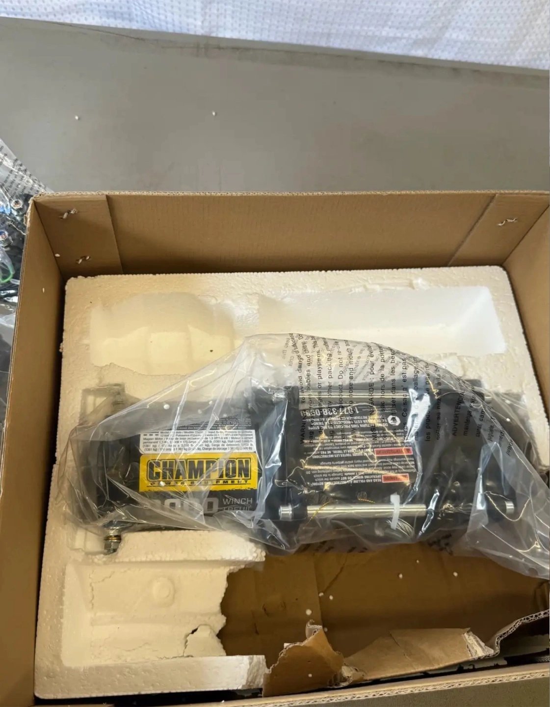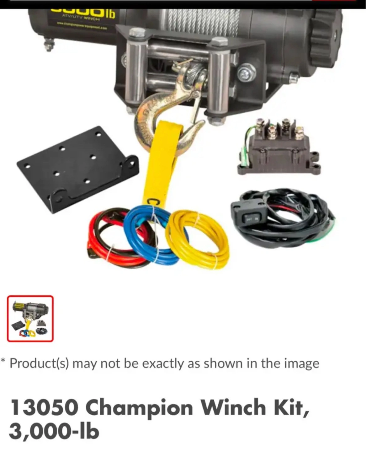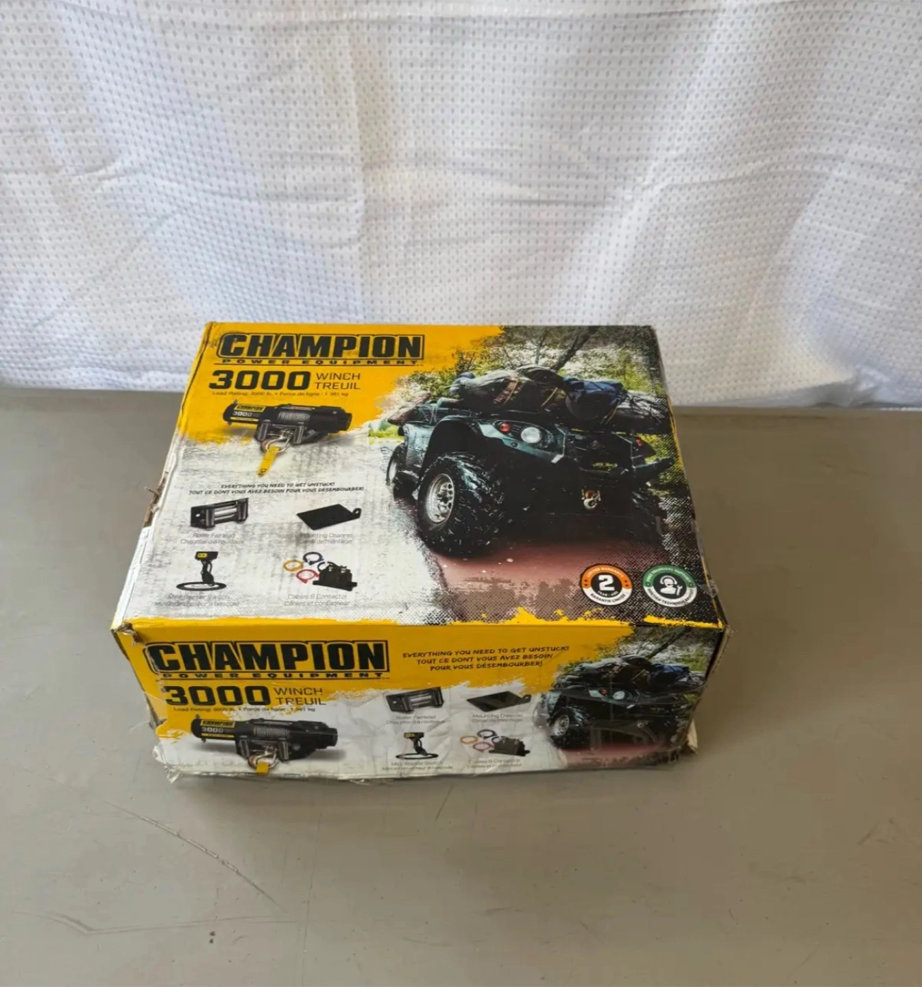 4313050 Champion Winch Kit, 3,000-lb Champion Winch Kit features a 3,000-lb (1360.7 kg) rated line pull Features a Permanent Magnet 1.3 hp (1 kW), 12V DC motor 3/16" x 45.9' (0.47 cm x 14 m) Galvanized steel aircraft cable with snap hook 171:1 gear reduction ratio Mountable rocker switch allows for easy operation Includes a flat bed mounting channel that allows for easy installation on your ATV or UTV Also includes a roller fairlead, power contactor, clevis hook and a cam action, free spooling clutch Retail PartSource: $219.99 + tax Canadian Tire: $219.99 + tax Asking: $160 Brand new never installed Comes in box and packaging opened for photos Pick Up Waterdown Area