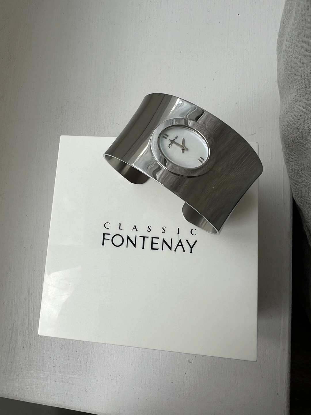 Selling a beautiful Classic Fontenay cuff watch in silver! It comes with its original box. This stylish timepiece is perfect for adding a touch of elegance to any outfit. It's in great condition and ready for a new home