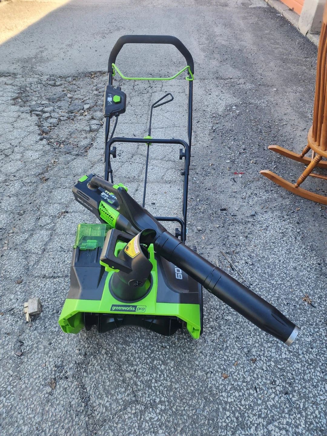 Selling a Greenworks Pro 60V snow shovel and leaf blower combo. Great for clearing snow and leaves quickly and efficiently. The set includes both the snow shovel and the leaf blower, all powered by the same 60V battery platform.