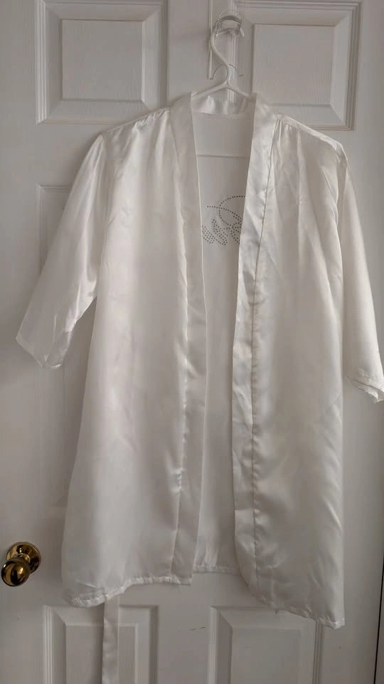 102Small/Medium Bride robe embroidered with rhinestones on the back, the rhinestones are a kind of crystal diamond with high quality, high brightness and clear cut surface, they are elegant and sparkling. Top craftsmanship & material: the satin fabric looks rich, smooth and lustrous, it is comfortable for women
