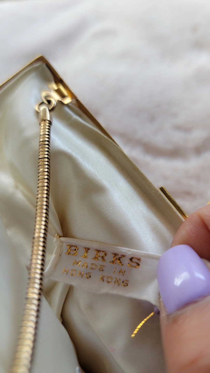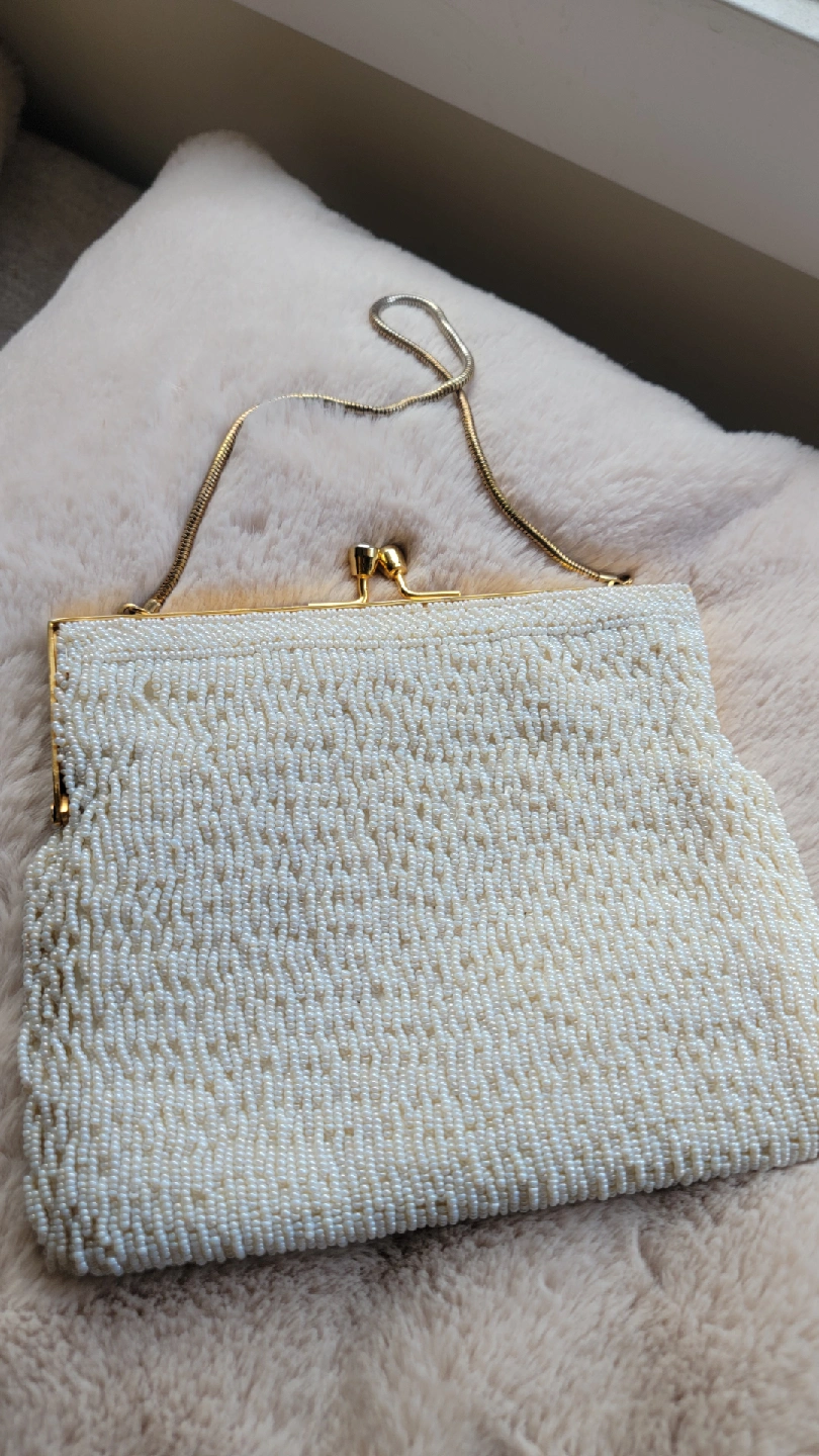 Selling a gorgeous vintage cream coloured Birks beaded clutch purse.