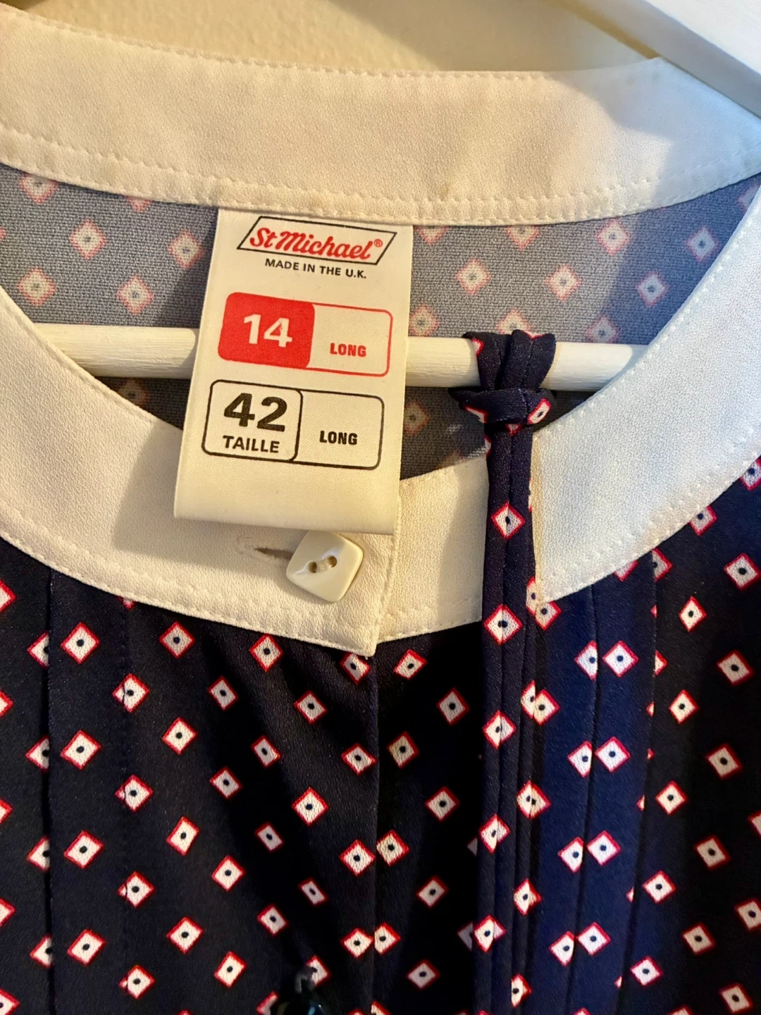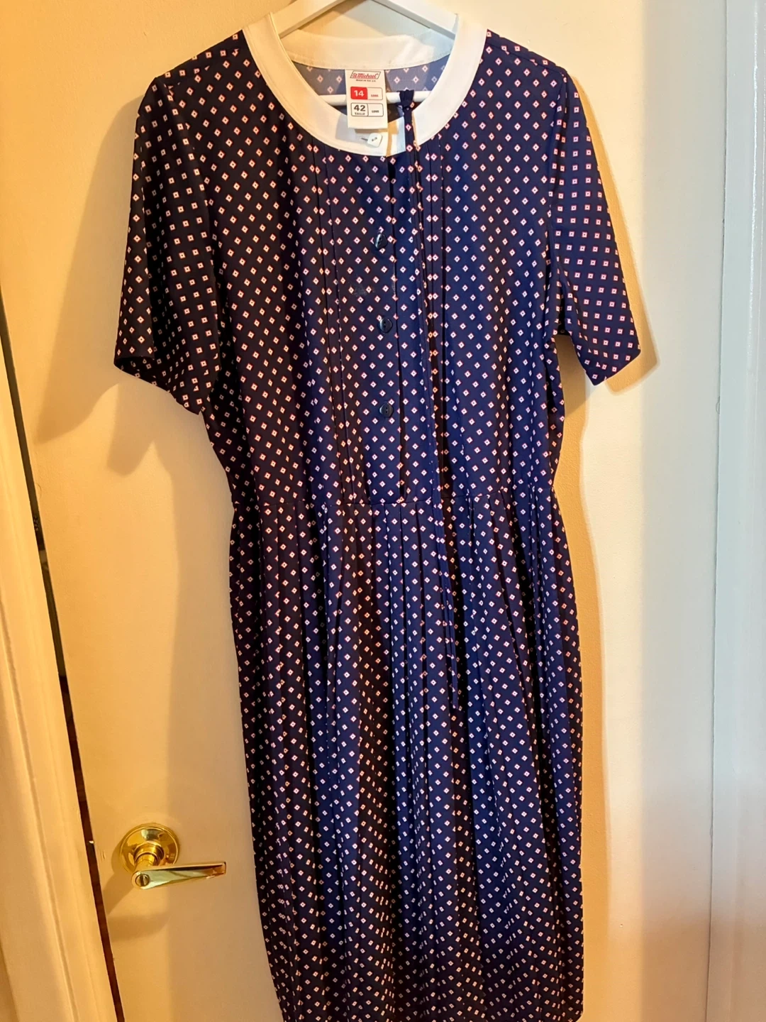 Selling a vintage St Michael dress in UK size 14. It features a lovely navy blue colour with a subtle pattern and a white collar. The dress is in great condition and perfect for adding a touch of retro charm to your wardrobe! It's a long style.