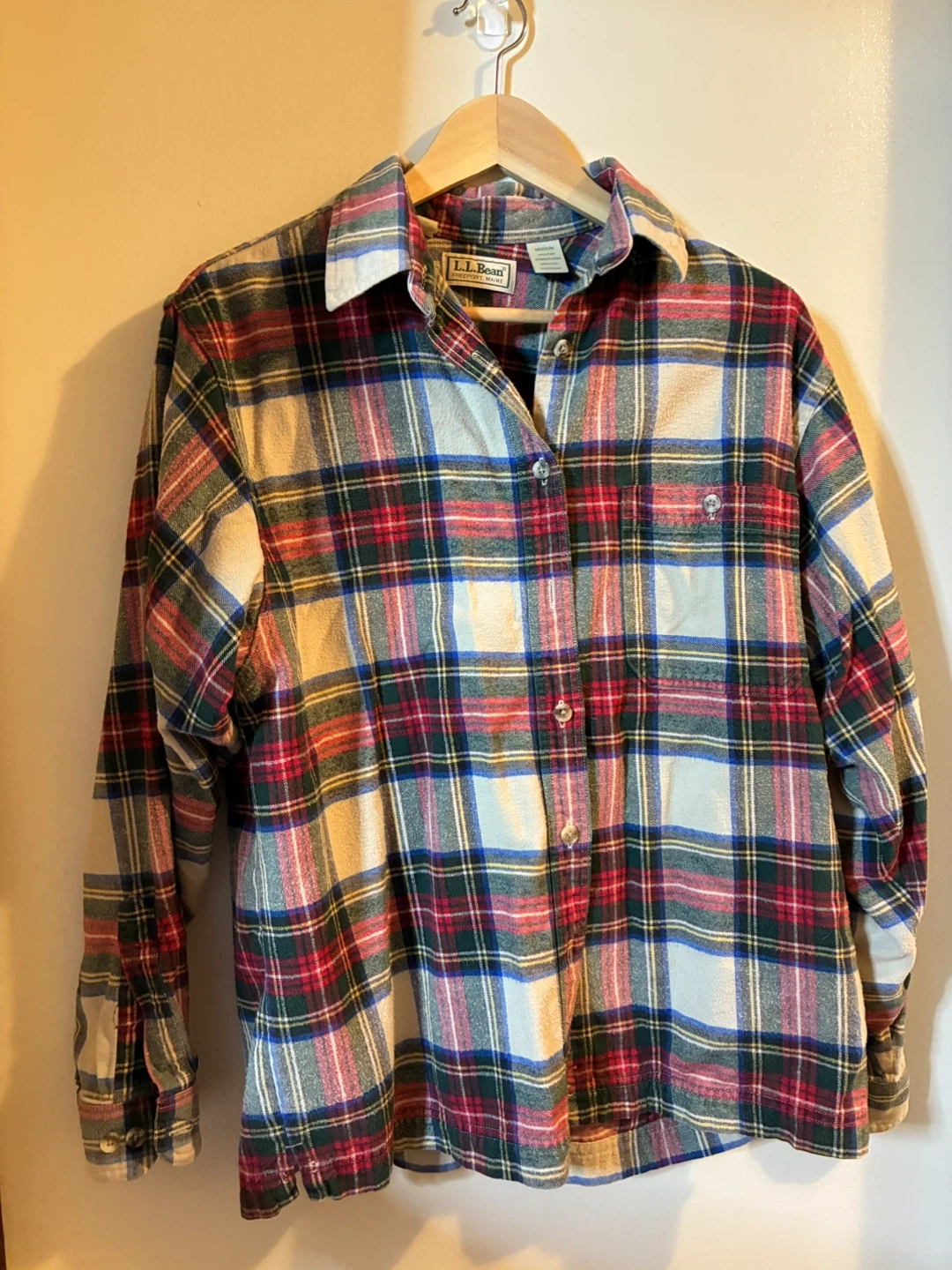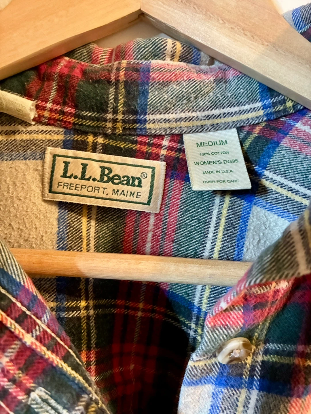 Cozy L.L.Bean women's flannel shirt in a classic plaid pattern! This shirt is made from 100% cotton and is a size medium. Perfect for layering or wearing on its own, it's a comfortable and stylish addition to any wardrobe