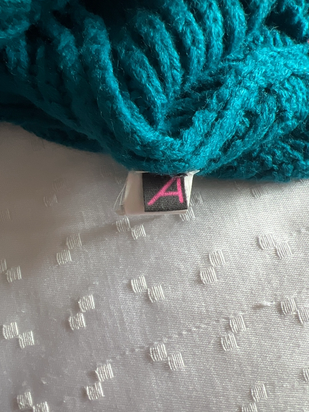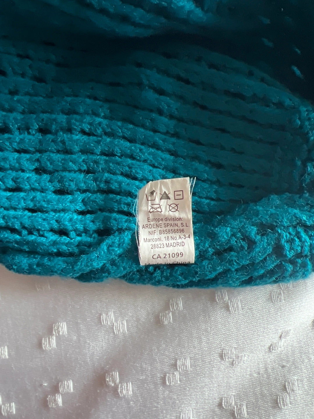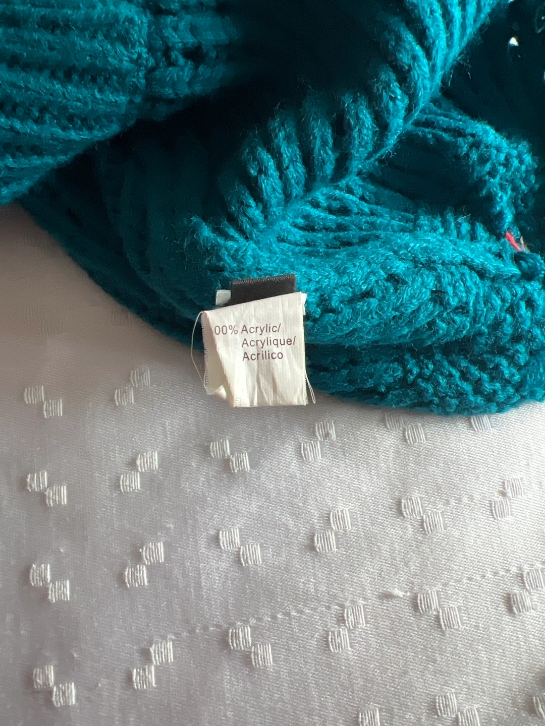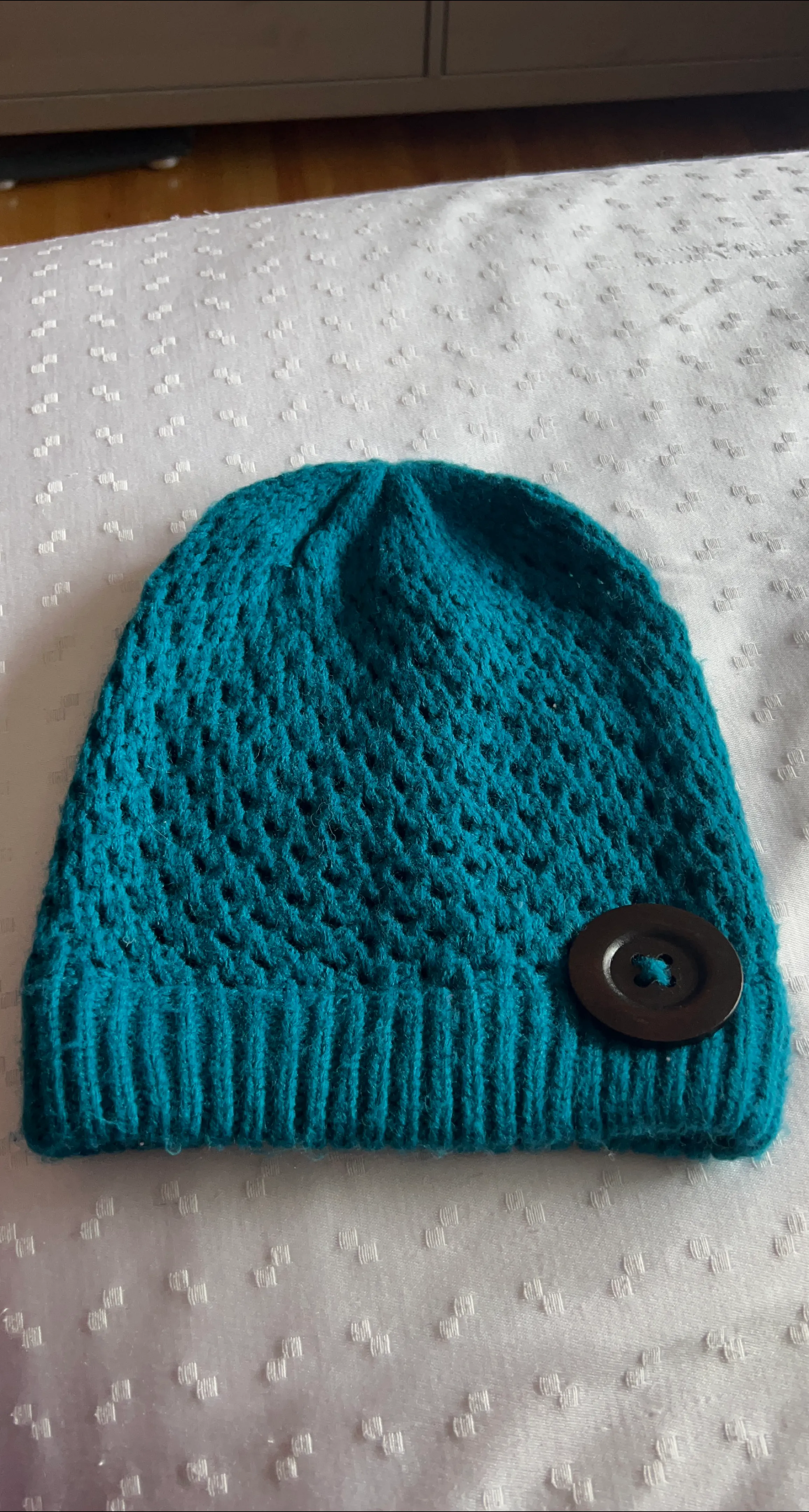 A cozy teal knit beanie, perfect for keeping warm during cooler weather. It features a unique knit pattern and a decorative button on the side. The beanie is made from 100% acrylic material.